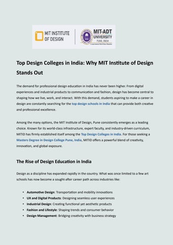 Among the many options, the MIT Institute of Design, Pune consistently emerges as a leading choice. Known for its world-class infrastructure, expert faculty, and industry-driven curriculum, MITID has firmly established itself among the Top Design Colleges in India. For those seeking a Masters Degree in Design College Pune, India, MITID offers a powerful blend of creativity, innovation, and global exposure.