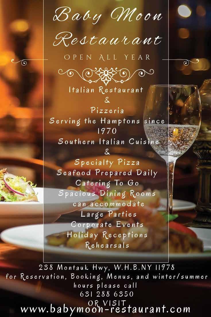 Eat in or take out. Excellent pizza and calzone specialties. Chef’s specials daily. On and off premises catering. Open 7 days for lunch and dinner. Reservations suggested. Locations in Cutchogue, Speonk, Northport, Mattituck 11 Eastport Manor Road, Eastport 631-325-1314