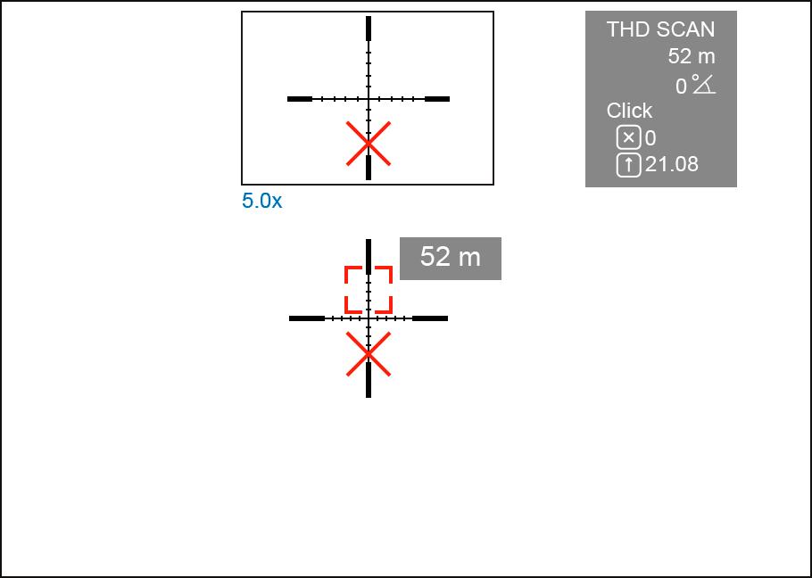After zeroing, the aiming reticle moves relative to the centre of the display and the rangefinder reticle