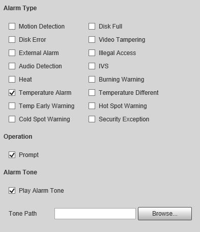 V 4.3.1 Prerequisite ..................................................................................................................................................................... 23 4.3.2 Playback Page 24 4.3.3 Playing back Video or Picture................................................................................................................................. 25 4.3.4 Clipping Video 27 4.3.5 Downloading Video or Picture ............................................................................................................................... 28 4.4 Reports 28 4.5 Alarm.............................................................................................................................................................................................. 29 4.5.1 Introduction to Alarm Types ................................................................................................................................... 29 4.5.2 Subscribing Alarm Information 30 5 AI function .............................................................................................................................................................................................. 32 5.1 Event 32 5.1.1 Alarm Linkage ................................................................................................................................................................ 32 5.1.2 Setting Period 34 5.1.3 Configuring Video Detection .................................................................................................................................. 35 5.1.3.1 Configuring Motion Detection .................................................................................................................... 35 5.1.3.2 Configuring Video Tampering 36 5.1.4 Configuring Audio Detection ................................................................................................................................. 37 5.1.5 Configuring Temperature Alarm 38 5.1.6 Configuring Abnormality ......................................................................................................................................... 39 5.1.6.1 Configuring SD Card Abnormality 39 5.1.6.2 Configuring Network Abnormality ........................................................................................................... 40 5.1.6.3 Configuring Illegal Access ............................................................................................................................. 40 5.1.6.4 Configuring Burning Warning 41 5.1.6.5 Configuring High Humidity Alarm ............................................................................................................ 42 5.1.6.6 Configuring Security Exception 42 5.2 Temperature Measurement ............................................................................................................................................... 42 5.2.1 Note 43 5.2.2 Configuration Flow ...................................................................................................................................................... 43 5.2.3 Configuring Thermal Image .................................................................................................................................... 43 5.2.4 Configuring Burning Warning ................................................................................................................................ 46 5.2.5 Configuring Temperature Measurement Parameters ................................................................................ 47 5.2.5.1 Configuring Temperature Measuring Rules 47 5.2.5.2 Configuring Temperature Contrast .......................................................................................................... 49 5.2.5.3 Configuring Global Setup 50 5.2.6 Configuring Temperature Alarm .......................................................................................................................... 52 5.2.7 Verification ...................................................................................................................................................................... 53 5.2.8 Isotherm ............................................................................................................................................................................ 54 5.3 Configuring IVS......................................................................................................................................................................... 56