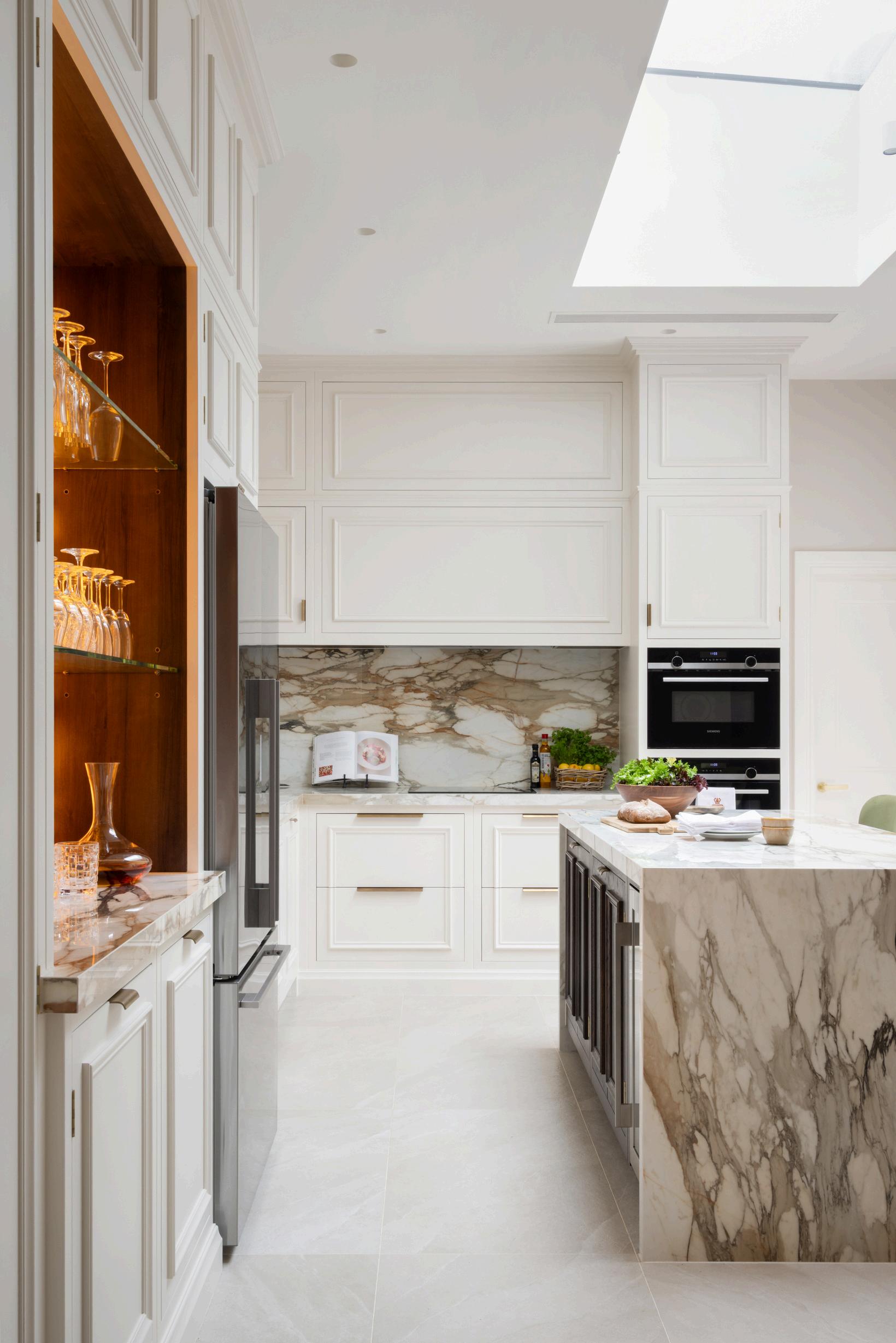 Thecentrepieceisthewaterfallisland,craftedinrichlyveinedporcelainandpaired withastrikingbook-matchedsplashback Stainedoakcabinetrygroundsthedesign withdepth,whilesoftneutralperimetercabinetryextendtotheceiling,bringing lightnessandheight