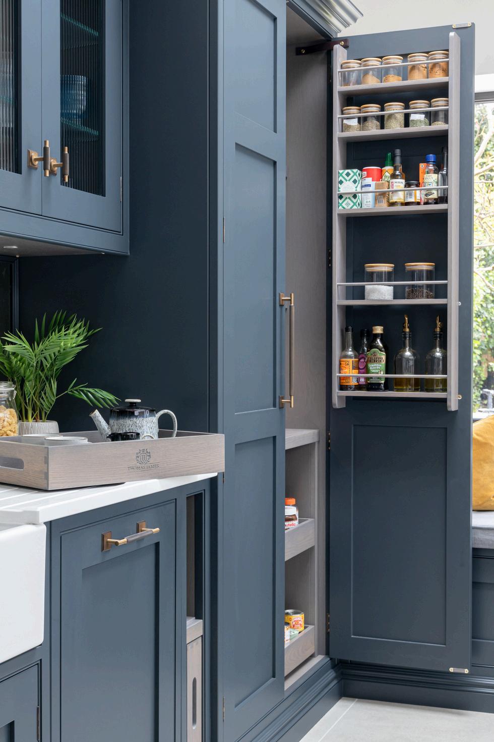 Awalk-inpantrysatnexttothedoubleovensTheidealplacetostoreingredientsand equipment-givingeverythinginthekitchenahomewhilebeingineasyreachofthe maincookingarea.Pantriesandlardercupboardsarealwaysatthetopofourclient’s wishlist,astheykeeptheworktopclutter-freeandensureeverythingisorganisedin thekitchenAndanorganisedkitchenisahappyone!