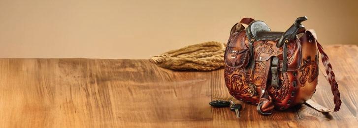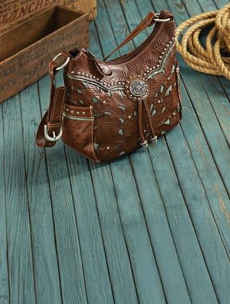 Shown in 11"H x 10"L x 5"W Handbag - $220 J | TOOLED LEATHER SADDLE HANDBAG