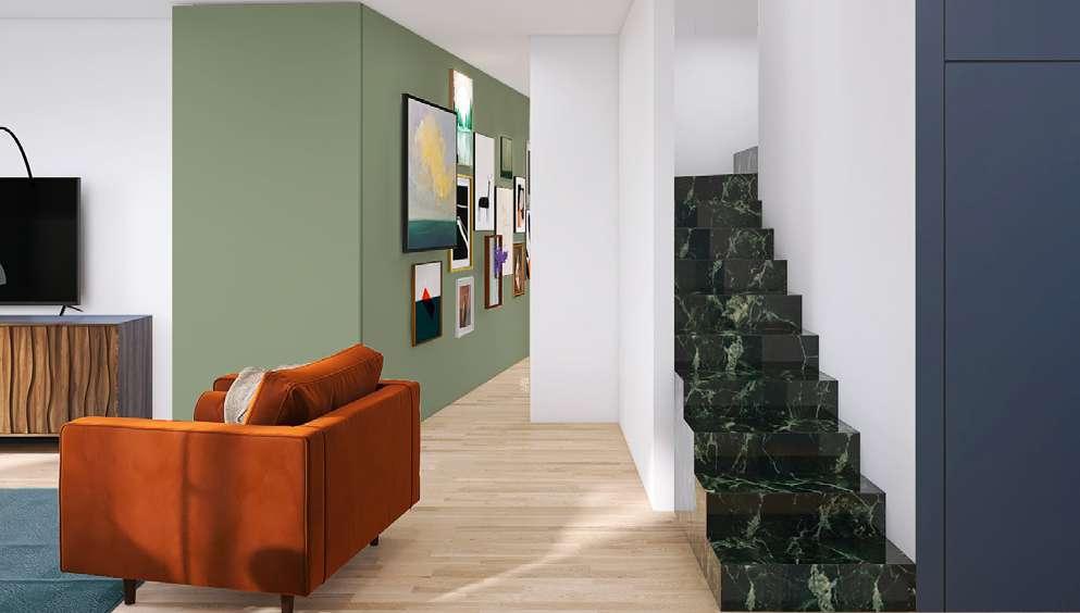 Na entrada foi feito um closet que dividiu a cozinha. A escada que leva ao piso superior está encravada entre as duas paredes e é embelezada com o revestimento de mármore verde Alpes. Na sala de estar foi construído um volume na cor verde que, com uma porta retrátil, nos leva para o banheiro e para o quarto atrás dele. Caminhando ao longo desse volume, você chega na sala de jantar e cozinha. A parede verde se torna um quadrado que atua como pano de fundo para a mesa de jantar, tendo uma forte relação com a cozinha que permanece aberta e separada apenas por uma bancada.