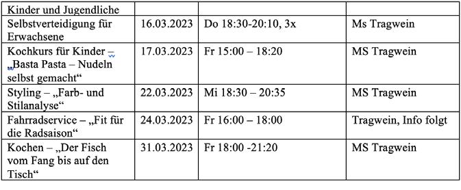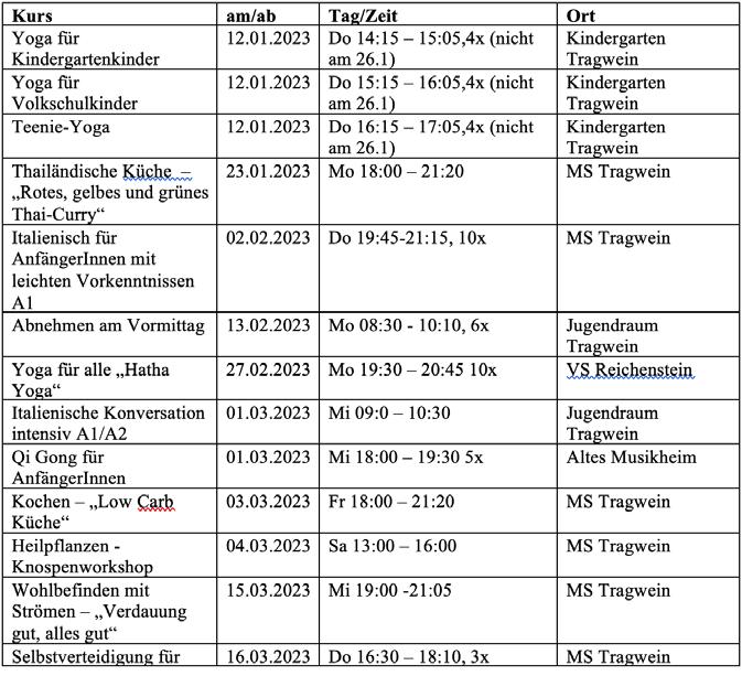 Anmeldung und Information: Mag.a Lucia Gusenbauer Tel: 0676 84 55 00 329 | Mail: tragwein@vhsooe.at Das gesamte Kursprogramm finden Sie auch online unter www.vhsooe.at und auch im Tragweiner Veranstaltungskalender