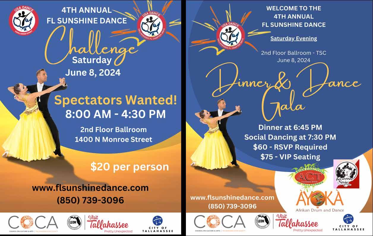 Join us for a fabulous evening for a “night on the town” with a catered dinner by Bella Bella, listen or dance to live music provided by the Tallahassee Swing band and enjoy a floor show with performances by the Asian Coalition of the Big Bend and the Akoya Afrikan Drum & Dance groups. Formal attire. Reservations required by May 28 at flsunshinedance.com. $60/person or $350 for table of 6. 6:30-10pm. 1400 N. Monroe Street, Tallahassee