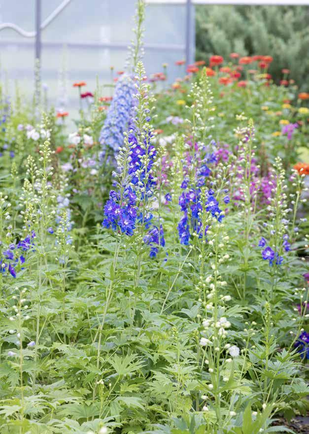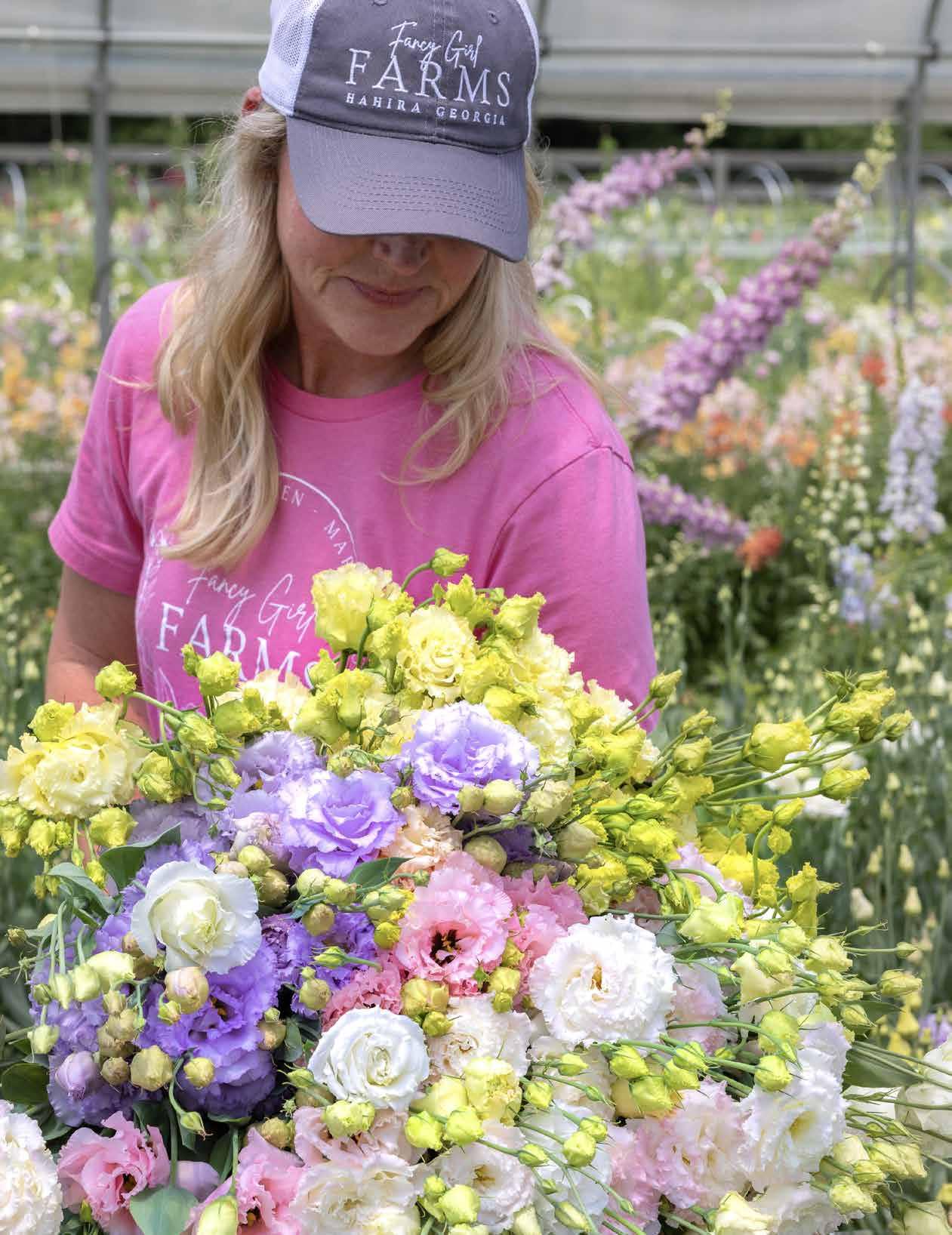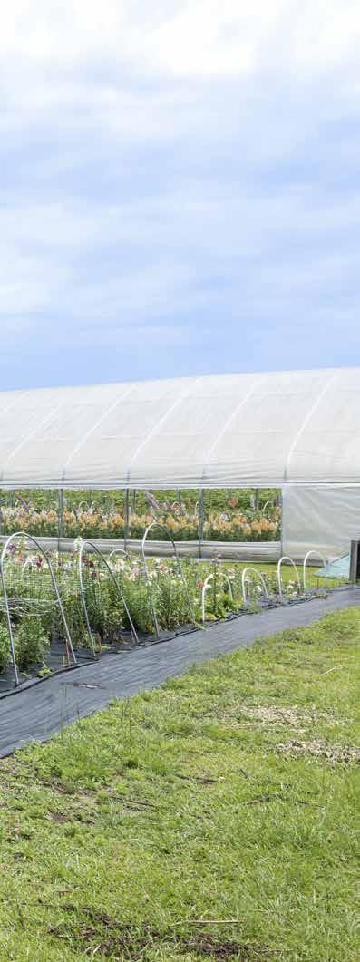through early July, due to the high temperatures and disease and insect pressure, the work required is year-round. Fields are prepped in September and then hardy annuals, such as snapdragons, ranunculus, and anemones, are planted in two sowings in late October/early November and then again in late December/ early January to allow for continuous blooms in early spring. Once those blooms fade away, they are followed closely by tender annuals that love the heat, such as sunflowers, zinnias, ageratum, and marigolds. In the last five years, Fancy Girl Farms has grown from one field to five. They now also have three high tunnels and a