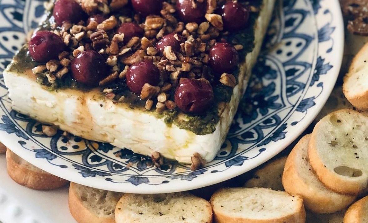 Heat oven to 350 degrees. Add feta to a small baking dish. Spread with generous layer of Sunnyland Farm’s pesto. Sprinkle with chopped pecans and add cherries, evenly spaced, across the top. Bake for 2025 minutes. Drizzle with honey after baking.