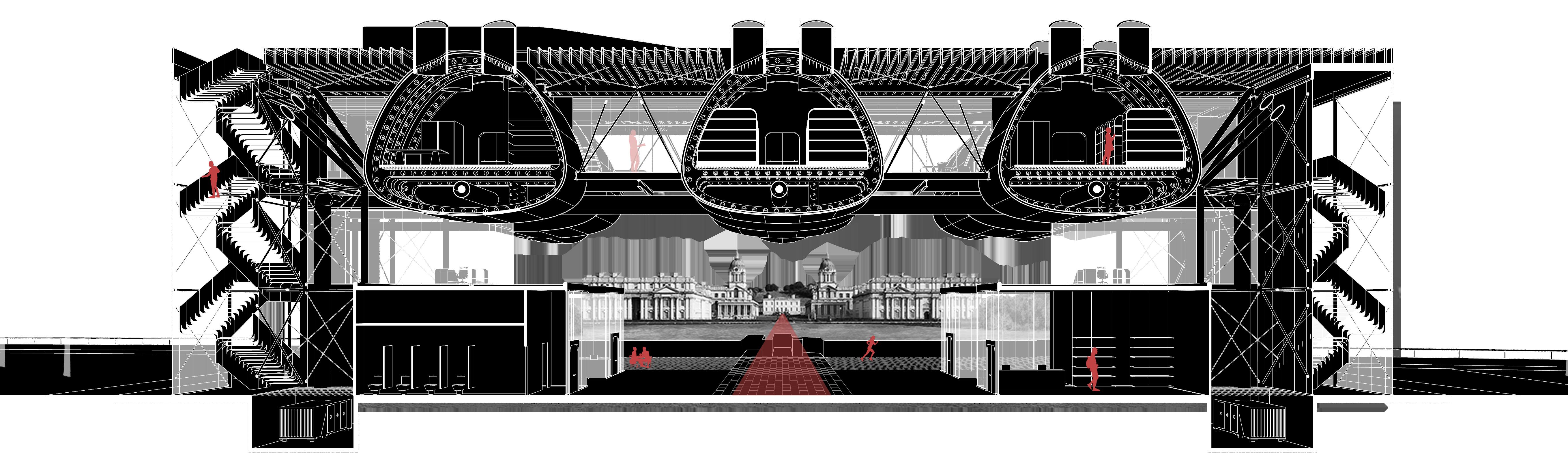 This project is a culmination of a semester long, team based, design competition studio. Logan and I were challenged to explore the boundaries of steel, graphically communicate our designs in a competition-based setting, and to develop our design further than any prior studio project. Our project explores the use of monocoque structures (typically used in aircraft) attached to a long-span steel truss system. The complexity of this system and its components was always a part of our daily studio conversations. Working as a team we focused on maximizing our output based on our individual strengths and how they could benefit the team. I placed a great focus on developing the relationship of the site with the Greenwich Axis, designing many of the programmatic spaces, diagraming the construction process, detailing several of the major design components, and visualizing the building through renderings. A process that developed over the course of the semester was our graphic design and communication. Being a competition studio, a heavy emphasis was placed on the boards we would be presenting what drawings to include, text size, graphic standards, and organizational hierarchy were all components that repeatedly evolved throughout the course of the semester.