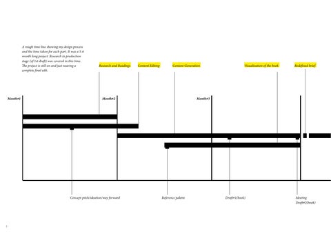 A rough time line showing my design process and the time taken for each part. It was a 5-6 month long project. Research to production stage (of 1st draft) was covered in this time. The project is still on and just nearing a complete final edit.
