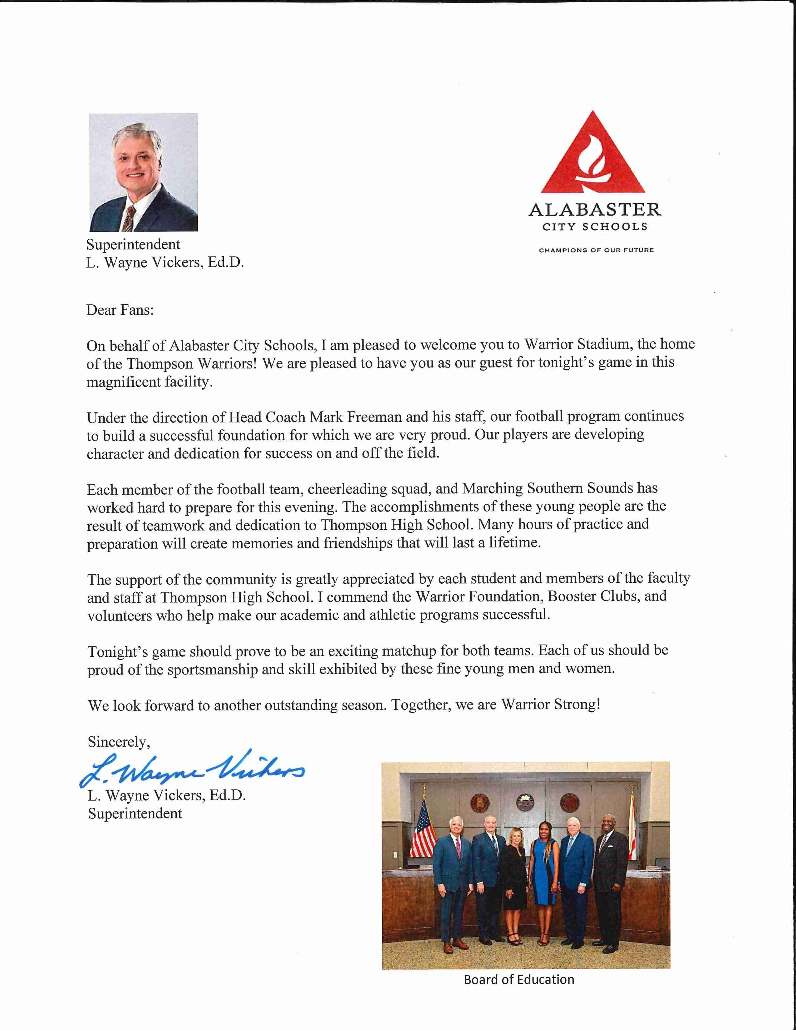 On behalf of the City of Alabaster, I welcome you to another season of Warrior football! The city is excited to welcome fans from all over the southeast to our beautiful high school. The Warriors have enjoyed unprecedented success over the last several years, winning four state championships in a row from 2019-2022 and playing in six consecutive 7A state championship games dating back to 2018.