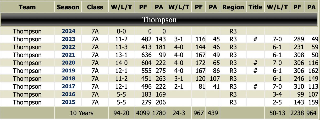 He has built a powerhouse at Thompson, winning four state championships in a row.