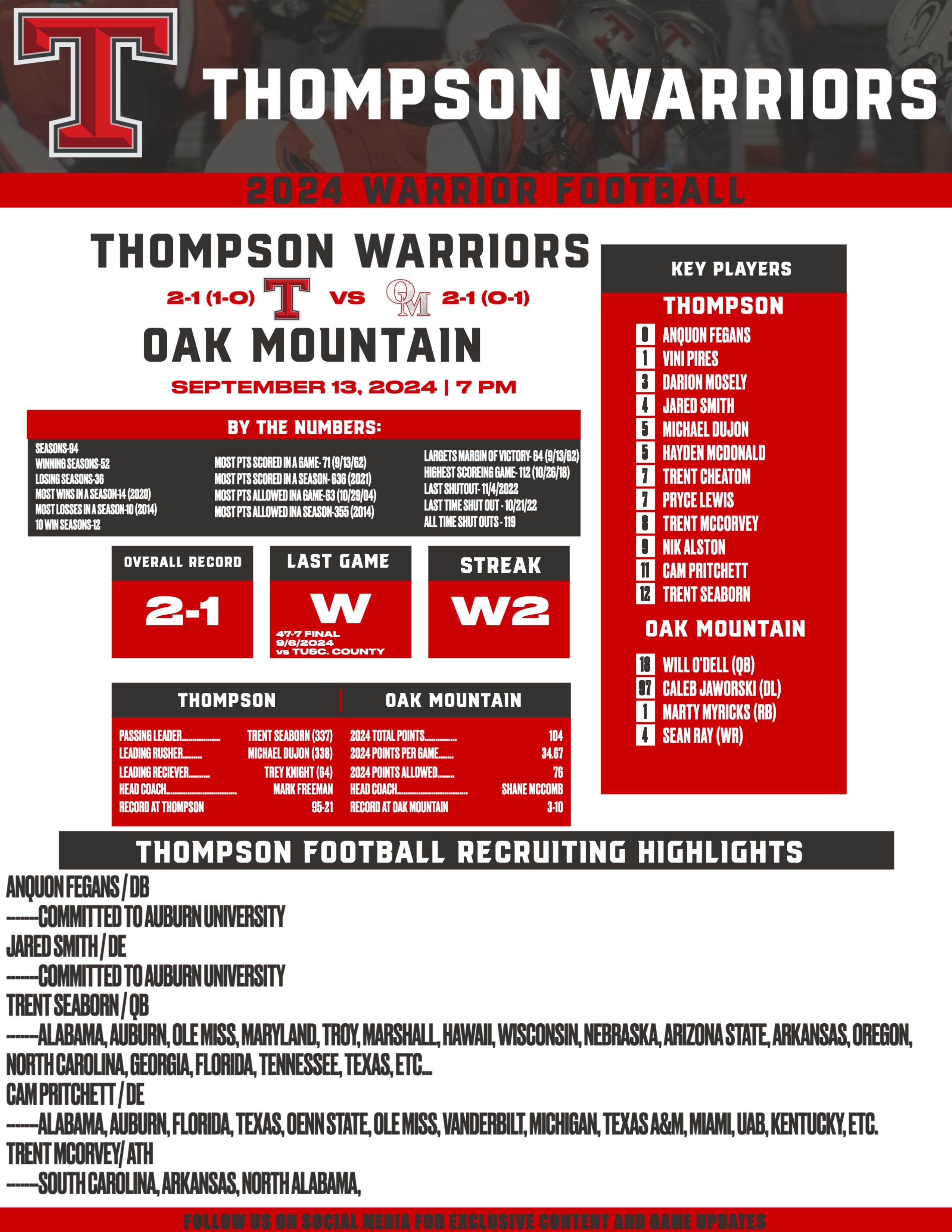 On behalf of the Thompson High School Athletics Department, I am excited to welcome you to Warrior Stadium, the home of the Thompson Warriors! We are thrilled to have you as our guest for tonight’s game, on the campus of Thompson High School