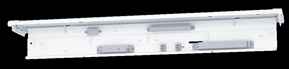 Da das Betriebsgerät vom Steg getrennt ist, kann die Leuchte an der Wand oder an der Aufhängung montiert werden, ohne dass ein Überkopfgewicht entsteht. Sobald der Steg befestigt ist, wird der Geräteträger einfach in zwei Schlitze eingehängt. Somit kann die Verkabelung bequem auf Augenhöhe erfolgen.