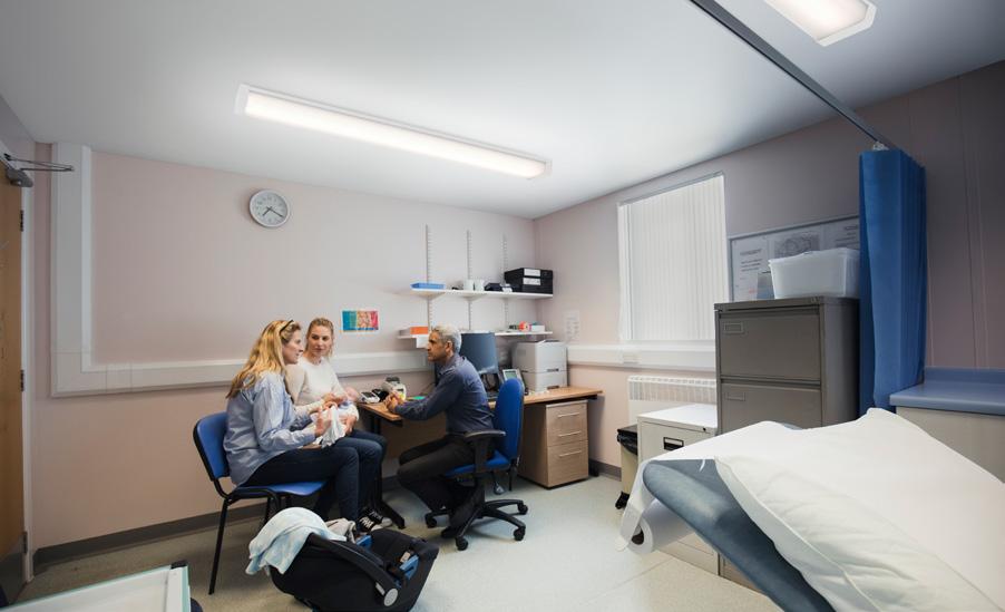 Diffuses, blendarmes Licht mit ausgezeichneter zylindrischer Beleuchtungsstärke, um Komfort und Kommunikation in Pflegeumgebungen zu verbessern. Optionale Nachtlichtfunktion verfügbar.*
