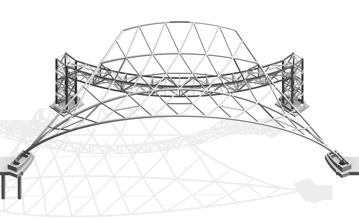 The site required two primary landing points at ground level, along with additional supports positioned higher up near the stage. The canopy’s leading edge was designed to follow the curve of the seating layout, while its rear edge (above the stage) was intended to align with the plan-view curvature of an existing lighting rig.