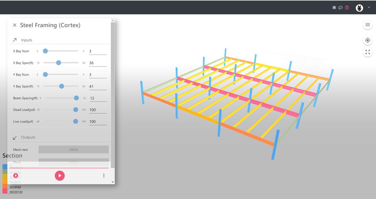• Steel Office/Lab Bay Design. This family of apps uses a trained ML model to predict steel framing sections for three to five continuous office or lab bays and incorporates strength and vibration considerations. The apps can be used as design checkers or schematic design tools.
