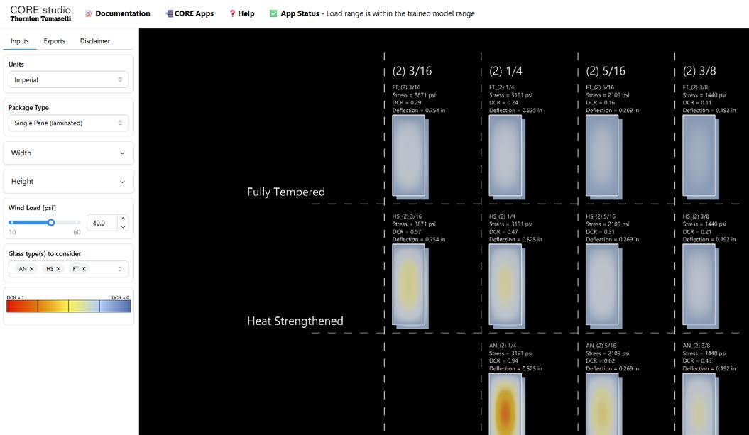 • Glass Designer. This lightweight web-based machine-learning tool enables our façade engineers to quickly evaluate glass designs and answer questions like “How wide can our panels be if we use only one-quarter-inch glass in an insulated glass unit (IGU)?” It delivers near-real-time design results under wind loads and allows selection from various glass buildups based on predicted stresses, displacements and design capacity ratios (DCRs).