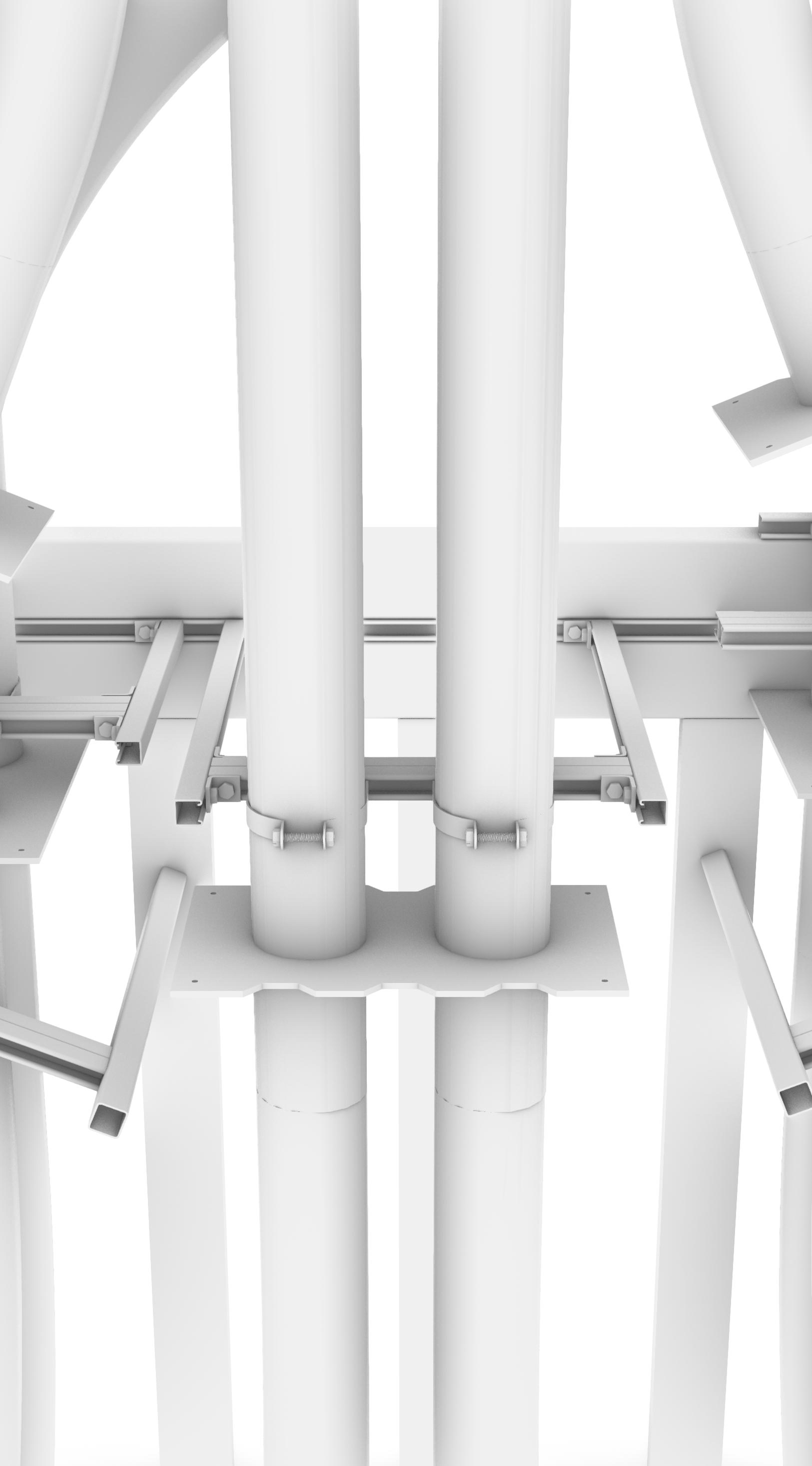 These parameters defined a set of fixed points that the structure’s edge beams needed to pass through. Between these nodes, a series of fabricatable and shippable arcs and line segments was generated to guide the bending of large-scale steel pipes. The infill framing was modeled with fabrication-level precision, including a consistent one-inch offset from the major structure’s centerline to allow for all-around welds.