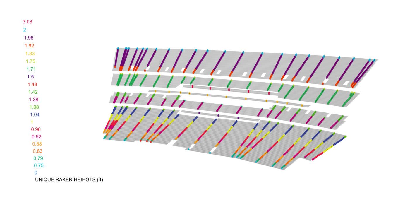 When Thornton Tomasetti's sports group needed to assess a stadium bowl’s geometry, CORE created a script to analyze the slope of raker beams and generate a “uniqueness” index. This helped quickly determine how many distinct slopes must be accounted for in design.
