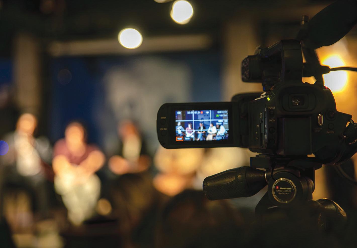 A camera films as the five presidential candidates take the stage during Monday night’s debate.