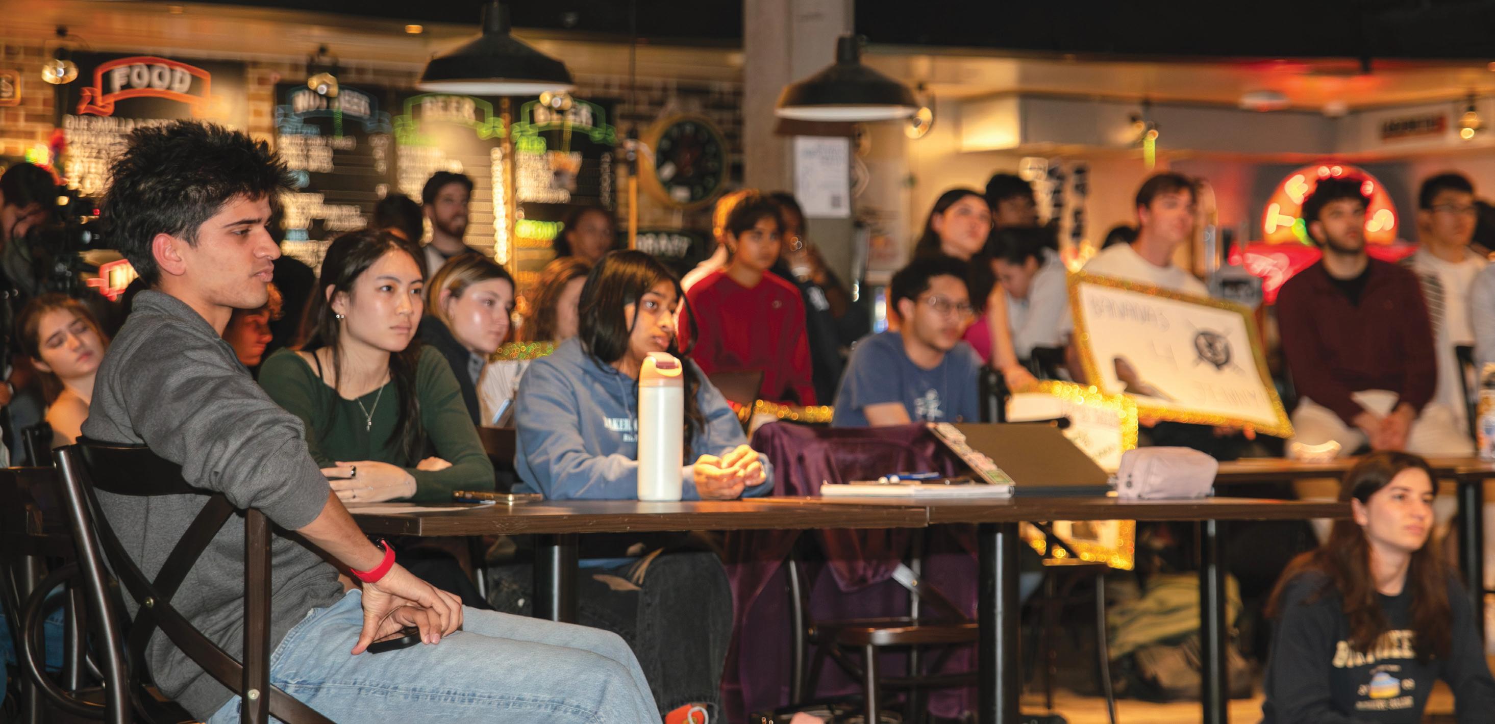Students gather at Pub at Rice to watch the Student Association election candidates debate their positions. This year, five candidates ran for president in the most crowded presidential race since 2003.