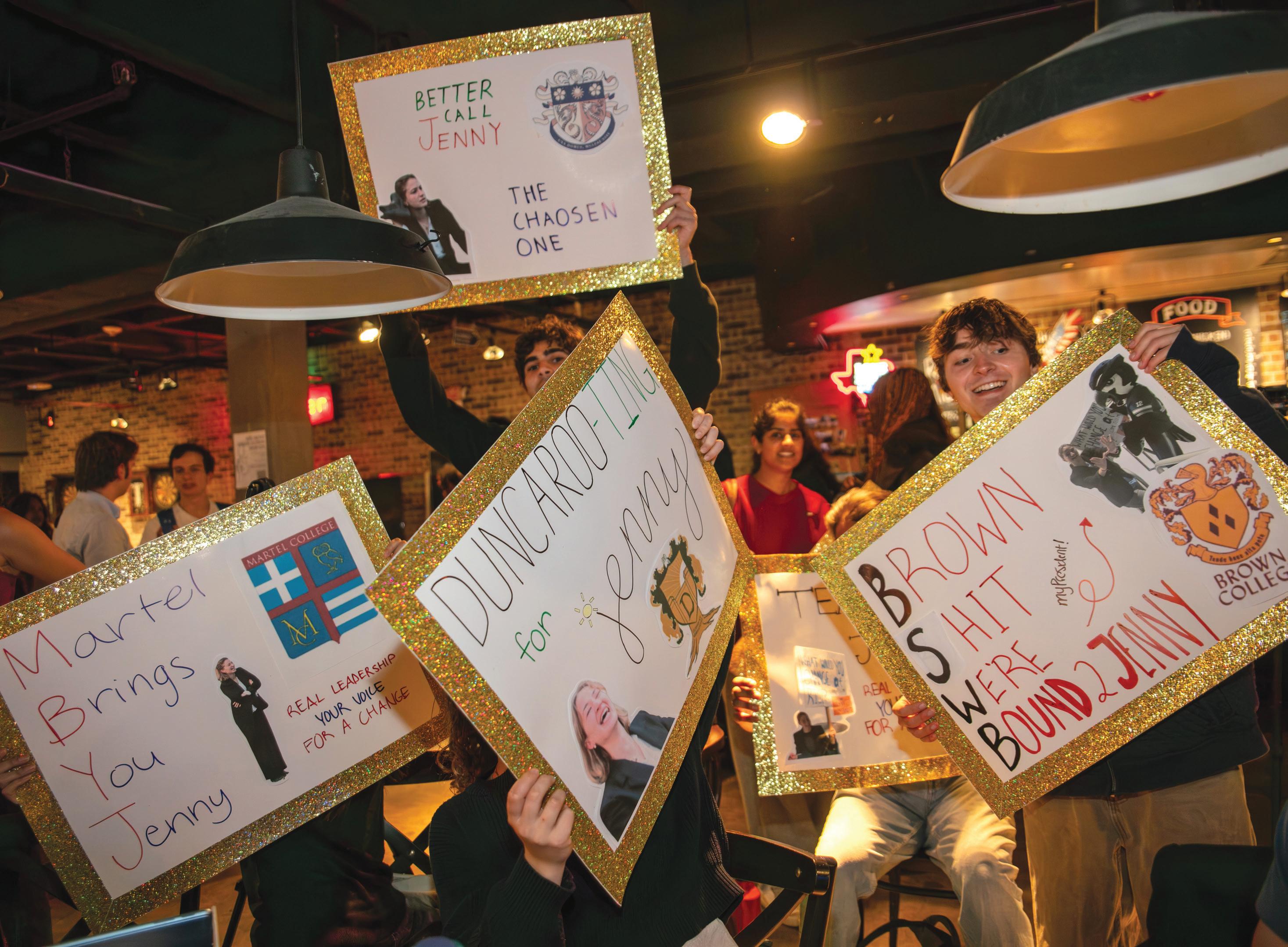 Students wave signs in support of presidential candidate Jenny Karsner at Pub at Rice on Monday night. Over 100 students gathered to watch the candidates debate.