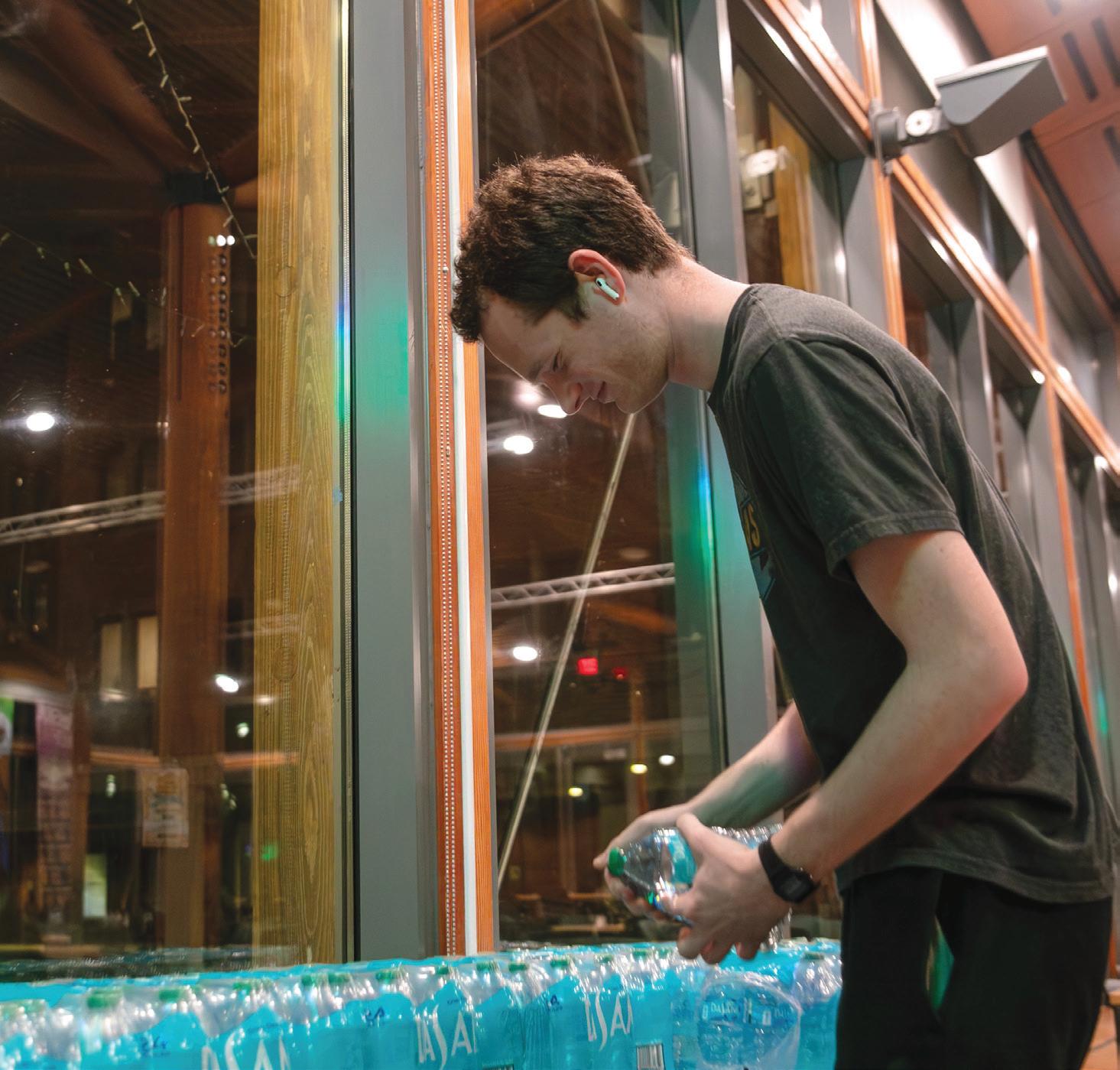 Max Phillips grabs a bottle of water in Duncan College Commons. Students were provided with bottled water after E. coli was found in the water at Lovett Hall.