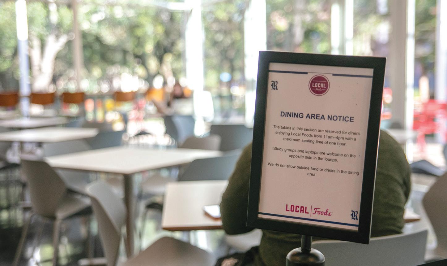 Local Foods has implemented a restricted seating policy on the table areas inside Brochstein Pavilion: Black retractable belt barriers now section o half of the space for paying customers. The new policy began on Nov. 25 and reserves 17 tables and four window counter seats for customers from 11 a.m. to 4 p.m. with a one-hour seating limit. Outside food and drinks are prohibited in the dining areas, according to the posted notice.