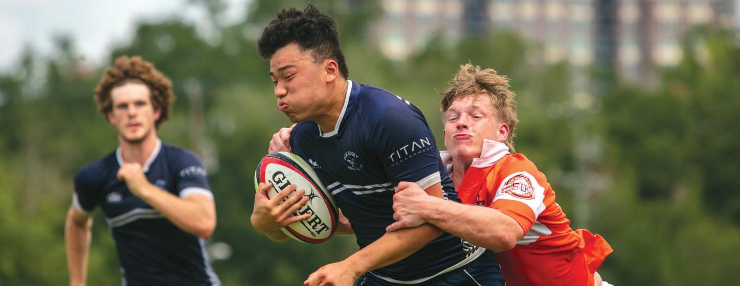 A Rice Rugby player runs with the ball during a Sept. 6 game against Sam Houston State University.