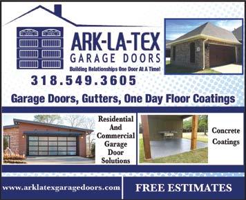 manual transmission. Good looking car! $51,000. (318) 344-7501 Place your EMPLOYMENT AD FOR *FREE (318) 415-6620 Wanting To Buy Producing Minerals Call (307) 575-9003 We will give you a FREE estimate with no obligation to you. Contact: Jimmy Miller (903) 733-5759 jwmillertimber@yahoo.com We Buy TimBer & TimBer Land (Ten Acre Minimum) We’vebeeninthe businessfor60years! Apostolic Center To Share & Care To Be Continued... COMING SOON Page 1 Production/Jan/Ark-La-Tex Garage Doors Oct 2020 Production/Jan/Ark-La-Tex Garage Doors Oct 2020 B R B ROWN HOME IMPROVEMENTS Providing Shreveport-Bossier and beyond with: • On-Schedule Service • Quality Craftsmanship • Transparent Pricing • Satisfaction Promise From the Roof of your house to the Fence around it WE BUILD IT RIGHT Decks • Porches • Fences • Carports • Insulated Windows • Installation of siding • Improving entryway doors • Painting…And much more Our craftsmen can replace cabinets, repair ceilings, and install fixtures so that you don’t have to search high and low for every single repair your home needs. (318) 208-5916 brownhomeimprovements.com Gober Post Gober Post Frame Buildings With 4” Concrete, Fully Insulated, 1- Commercial Overhead Door, 1 Entry Door, #1 29 Ga. 40yr. Painted Metal, Built on your level site. Additional Sizes Available, Mileage or Higher Concrete Prices May Apply. Protect Your Home and Property!! Make Sure Your Contractor is Following the Law. Ask For General Liability and Works Comp. Insurance www.goberconstruction.com •Shops •Garages •Houses •Agriculture •Commercial 405-595-0770 30’x40’x10’..$20,400 30’x40’x12’..$22,600 30’x50’x10’..$24,600 30’x50’x12’..$26,700 CALL NOW 1-833-736-1090 Voice-Activated! No Wi-Fi Needed! O er code: CARE20 $20 OFF Mobile Companion The World’s Most Advanced Medical Alert System