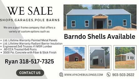 of Marshall, Houston & Weatherford We shine above all the rest! Check Out Our Website: www.MetalBarnsAndGarages.com Sales 318-816-2589 METAL BUILDINGS OF ALL SIZES Shops • Garages • Barns • Equipment Sheds • Metal Roofs GALVANIZED BUILDINGS ALSO AVAILABLE 24X30X10 - 30X30X10 - 30X40X10 - 30X50X10 WE BUILD ANY SIZE Includes all labor, tractor work and concrete slab with moisture barrier and electric stub. Standard doors (1) 10x10 roll up or 10x7 garage door and (1) steel walk-in door. (Pad dirt may be extra). We use all the best materials starting with 6x6 ground contact poles, with a lifetime warranty and a 40 year warranty on our painted metal. We offer a 4 inch 3000 psi concrete slab. Reinforced with 3/8” Rebar Five Starr Truss Company Roof Trusses Floor Trusses Laminated Beams Truss Hardware 903-930-2758 We sell to contractors and the public! Will beat any same spec. pricing! Realtor License #995706536 • 318-519-7385 alanahunter.home@gmail.com ARK-LA-TEX G A R A G E D O O R S Building Relationships One Door At A Time 318.549.3605 • G a r a G e D o o r s • G u t t e r s • o n e D a y F l o o r C o n C r e t e C o a t i n G s r e s i D e n t i a l & C o m m e r C i a l D o o r s o l u t i o n s F r e e e s t i m at e s w w w a r k l at e x G a r a G e D o o r s C o m j NURSES AIDS LOOK! YELLOW NURSES aids uniforms, all new, Lg & XL, $10.00/Set or all for $85.00 (318) 220-6153 Free Karate Classes! Friday, March 15th at 4:00 pm for ages 6-10. Sign up your child at Shreve Memorial LibraryNorth Caddo Branch in Vivian, LA. God bless you