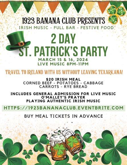 Pecan & Peanut Brittle � Chocolate & Peanut Butter Fudge � Jumbo Cupcakes � Cookie Cakes � Pralines & More! 318-617-5694 FREE Delivery! We Cater! We will give you a FREE estimate with no obligation to you. Contact: Jimmy Miller (903) 733-5759 jwmillertimber@gmail.com We Buy TimBer & TimBer Land (Ten Acre Minimum) We’vebeeninthe businessfor60years! COINS & COLLECTIBLES BOSSIER CITY CASH FOR GOLD AND SILVER 1830 Old Minden Rd. (318) 562-3990 Email: bossiercitycoins@gmail.com Buying gold, silver, Broken gold & silver jewelry, coins collection, us currency, sterling silver forks, and spoons, call for appointment. SURGEON GENERAL'S WARNING: QUIttING SmOkING NOW GREAtLy REdUcES SERIOUS RISkS tO yOUR HEALtH Lucky Strike $45.24 American Spirit $96.09 Winston $78.48 Camel $76.22 Select Newport $73.08 Marlboro $78.91 Kool $70.76 Pall Mall $64.30 Cigarettes 4422 Youree Drive Shreveport, LA. 71105 (318) 861-2243 3055 East Texas Street Bossier City, LA. 71111 (318) 746-7700 9464 Mansfield Road Shreveport, LA. 71118 (318) 686-5991 707 S. Pine Street Vivian, LA. 71082 (318) 375-2969 6730 Pines Road, Ste. 206 Shreveport, LA 71129 (318) 683-0069 EARN 1 POINT FOR EVERY DOLLAR YOU SPEND! 525 POINTS= $7.50 OFF YOUR NEXT PURCHASE! Longhorn Pouches (5 Can roll) $10.35 Red Seal $20.68 Longhorn $14.20 ZYN $2694 Timberwolf Pouches $10.55 Grizzly $24.87 WTG Copenhagen $21.22 Timberwolf $26.79 (Mint & Mint Pch L/ cWtg, Wtg Pch) Cougar $11.44 Carton of 3oz Packages Levi Garrett $216.59 Taylor Pride $216.59 Trophy BIG1 $58.59 Beech Nut 3pk $88.49 Starr BIG1 $39.59 Southern Pride $101.20 J.D.'S Blend $99.99 America’s Best $60.29 America’s Best Silver $60. Carton of 1lb. Packages Stoker $101.79 J.D'S Blend $111.49 Southern Pride $111.49 Big Duke $59.94 Tobacco House Cigarettes, Cigars smokeless tobaCCos Zydeco chop chop .............. $7.69 hot Rods Gawlic Buttah ...... $7.19 hot Rods tequila lime ......... $6.29 hot Rods cReole BBq RuB .. $7.79 �� �� �� �� �� �� �� �� 2201 A irline D r . S te . #100 SS ier C ity , l A 71111 (Adjacent To Rose-Neath Funeral Home) (318) 415-6620 • (855)232-7704 www.thriftyclassifieds.net SERVICING TEXARKANA AREA, SHREVEPORT & BOSSIER Saint Paddy’s day events! Check out page 16 for all the events going on in your area! Look here for great deals on cars, trucks, auto parts, lawn equipment & more!