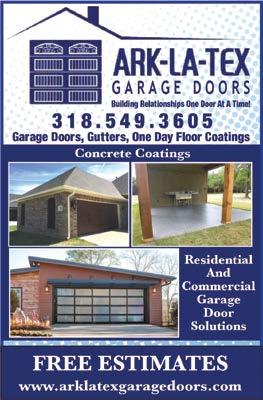 of Marshall, Houston & Weatherford We shine above all the rest! Check Out Our Website: www.MetalBarnsAndGarages.com Sales 318-816-2589 METAL BUILDINGS OF ALL SIZES Shops • Garages • Barns • Equipment Sheds • Metal Roofs GALVANIZED BUILDINGS ALSO AVAILABLE 24X30X10 - 30X30X10 - 30X40X10 - 30X50X10 WE BUILD ANY SIZE Includes all labor, tractor work and concrete slab with moisture barrier and electric stub. Standard doors (1) 10x10 roll up or 10x7 garage door and (1) steel walk-in door. (Pad dirt may be extra). We use all the best materials starting with 6x6 ground contact poles, with a lifetime warranty and a 40 year warranty on our painted metal. We offer a 4 inch 3000 psi concrete slab. Reinforced with 3/8” Rebar Five Starr Truss Company Roof Trusses Floor Trusses Laminated Beams Truss Hardware 903-930-2758 We sell to contractors and the public! Will beat any same spec. pricing! Brown Home Improvements BrownHomeImprovements.com 318-208-5916 Serving n. W. LouiSiana & e. TexaS LicenSed & inSured • Screen roomS • Wooden deckS • compoSiTe deckS • covered deckS • roofing • rampS • WindoWS • Siding • painTing • carpenTry • fencing caLL for free eSTimaTeS We Loan Money! Against Your: Home Land Commercial Properties EQUITY HOME LEADERS, INC. 318-747-9999 TOLL FREE: 855-746-8781 NO CREDIT CHECK Louisiana Only Lic. # NMLS#335893 Pets fill our days with love and joy. No one ever wants to imagine their pet sick or injured. But with Physicians Mutual pet insurance, you can help keep your pet healthy and happy. Affordable pet INSURANCE Physicians Mutual Insurance Company For complete details, including costs and limitations, please contact us. Product not available in all states. 6294 100% reimbursement on vet bills available No lifetime limit on benefits Go to any vet Help protect your pet and pocketbook 1-888-305-2349 InsureBarkMeow.com/Thrifty