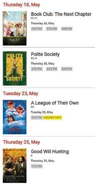 Page 16 (318)415-6620 • www.thriftyclassifieds.net May 18, 2023 NORTHWEST EVENTS & INFORMATION SHREVEPORT/BOSSIER CITY Events TEXARKANA Events Thur, May 18 Book Club The Next Chapter PG-13 5:30pm 8:00pm Thur, May 18 Polite Society PG-13 6:00pm 8:30pm Tue, May 23 A League of Their Own PG 6:00pm Thur, May 25 Good Will Hunting R 7:00pm May Markets and Music. . . . . . . . . . . . . . . . . . . . Thu, May 18, 4 – 8 PM, Windrush Park Chicken Brothers band. . . . . . . . . . . Fri, May 19, 8:00 – 11:59 PM, Bayou Thunder Saloon Aces & 8’s. . . . . . . . . . . . . . . . . . . . . . . . . . . . . . . . . Fri, May 19, 6 – 9 PM, Ki' Mexico The Joanitones. . . . . . . . . . . . . . . . . . . Sat, May 20, 8:00 – 10:30 PM, The Noble Savage Family Adventure Day. . . . . . . . . . . . . . Sat, May 20, 9 AM – 12 PM, Richard Fleming Park DELTA Live, Country Music Dance. . . . . . . . Sat,