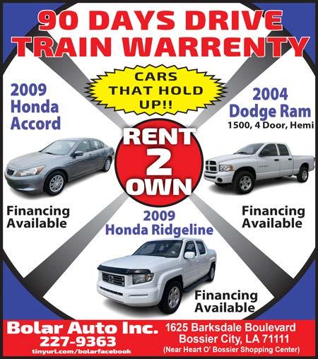 sales a plus but not required. Must have own transportation. Bring resume to 2201 Airline Drive STE 100 Bossier City, LA 71111 (318) 4156620 Leave message. Professional Employment LIFEOLOGIE INSTITUTE IS LOOKING to hire a Counselor. Hybrid/ remote in Bossier City, LA. Full-time. Hiring multiple candidates. To apply: https://www.indeed. com Child/ Elderly Care 4 VETERAN NEEDS HELP WITH house cleaning, sitting, and light cooking. Call (318) 5726186 or (318 5735482. Office/ Clerical HENDRICKS GLOBAL, LLC LOOKING to hire Customer Service Representative. Full-time, contract. To apply: https://www.indeed.com Career Training HALLIBURTON LOOKING TO HIRE Operator Assistant Trainee- Cementing. Must be able to obtain a Class A CDL license. To Apply: https://www.indeed.com Business Opportunities FARMASI. LOOKING TO MAKE extra money? Sell makeup & skin care. Call Mary (903) 733-0020 EmploymEnt SEction Find thE EmployEES you nEEd • *Buy 2 WEEkS, GEt tWo WEEkS FrEE! * Buy Two Weeks Get Two Weeks only applys to Employment reader ads not display. Domestic BENT RIMS? CRACKED RIMS? Curb Rash? Maybe you want your a different color? We have you covered! BC WHEEL REPAIR , 1625 West Kirby Place, Sheveport LA, 71103. (318) 489-7521 2020 HONDA CIVIC Hatchback Sport, #LU220366, $26,521. Rountree Ford, Shreveport Auto Mall, (318) 798-3673. https:// www.rountreeford. com 2021 FORD MUSTANG EcoBoost Premium, #M5114058, $29,998. Rountree Ford Shreveport Auto Mall, (318) 798-3673. https:// www.rountreeford. com 2018 FORD MUSTANG EcoBoost,