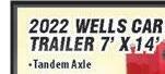 2022 WELLS Cargo 7'x14'. 7' int height, spare tire, rear ramp door w/ RV entry door. $9,800. Grover's All Wheels. 4140 E 645 N,Rigby. 208-745-7077 or 208-351-3755.
