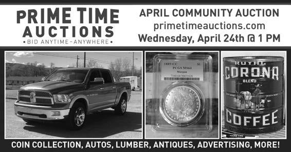 AUCTION COMPANY TYPE OF AUCTION ADDRESS PHONE NUMBER DATE TIME WEBSITE PRIME TIME AUCTIONS FAYLE ESTATE-SHELLEY TBA • Shelley, ID 208-232-4912 MAY 1 ONLINE 1:00 pm www.primetimeauctions.com BLUE MULE AUCTIONS ONLINE YARD ART AUCTION 176 S. State Street • Shelley, ID 208-520-3253 OPENS MAY 4 “ONLINE” MAY 9 SOFT CLOSE 10:00 am 6:00 pm www.bluemuleauctions.com BIGHORN AUCTION CO ONLINE ESTATE AUCTION 2895 N. Holmes • Idaho Falls, ID 208-522-7984 APRIL 23 SOFT CLOSE 6:00 pm bighornauctions.hibid.com PRIME TIME AUCTIONS PRECIOUS METALS, LUMBER, AUTO/RV 2221 South 5th Ave • Pocatello, ID 208-232-4912 APRIL 24 ONLINE 1:00 pm www.primetimeauctions.com PRIME TIME AUCTIONS AUTO, RV, EQUIPMENT 2221 South 5th Ave • Pocatello, ID 208-232-4912 APRIL 24 ONLINE 1:30 pm www.primetimeauctions.com 2024 AUCTION CALENDAR ROCKER/RECLINER LIGHT gray, smaller size, like new. Pocatello 208-241-5352. GLOCK 20 with 3 barrels and 3 clips, $650. 500 rounds of ammunition and loading supplies, $850. Savage model 12 with a Belle and Carlson stock, $1000. 300 rounds of loaded ammunition, dyes, powder, bullets and primers, $600. 208-540-1610. QUEEN SIZE medical bed with mattress, fully adjustable, great shape, $600. 208-521-7894. MOVING SALE, many items including, washer/ dryer $400. Kitchen table, 4 chairs, $100. Queen size bed, with new mattress, $200. Oak dresser, $100. Exercise bike $25. Recliner $20. Idaho Falls 510-925-6785. AKC PAPERED male, fox red Lab, amazing bloodlines, 1 year old, $250. 208-339-6938. SPRING IS HERE! Arbor Tech provides these services: Tree pruning and removal, stump grinding. Please call 208-881-6989 to schedule bids for service. PACIFIC RECYCLING see our ad on page 2. Eclective Treasure Estate Sale!!! Glassware, Art!!, Decorative Dishes, MCM Lamps, Vintage Clothes, Household Items, Washer Dryer, Sewing Machines, Vintage Scales, Yard Art, Clawfoot Tub, Lots of Jewelry, Furniture, Collectibles and so much more! Amazing Picker Estate!†1582 Elmore Avenue, Idaho Falls, ID Thursday 18th 2pm-6pm - Fri-Sunday 21st 9am-3pm. See mjsvintage.com for pictures! THOMPSON CENTER Encore, Pro Hunter rifle with 2 barrels, 22-250 and 243, all stainless, $900. 208-840-9002. LAWN & GARDEN GARAGE SALES STAND UP chair for elderly, for standing, reading, and circulation. Great shape, $300. 208-521-7894. 20 GAUGE Hatfield shotgun, single action, good condition, $100. Fly tying box, tools, vice, hackel, hooks ect. $125. 208-716-0495. Pocatello, Idaho CHEVROLET Requirements: • Dependable • Self-motivated • Positive attitude • Learns quickly WE OFFER: • Competitive compensation Health care, paid vacation & other benefits • Training • Team atmosphere • Will train the right candidates! NEEDED: SALES TEAM MEMBERS! Call Karla at 208-237-2438 or send resume to kblanco@colechevrolet.com We can’t wait to find the next members of our team! NO EXPERIENCE NECESSARY, WE ARE WILLING TO TRAIN! CASHIER/RECEPTIONIST SALESPERSON ASSISTANT CONTROLLER SALES/CUSTOMER SERVICE REPRESENTATIVE FULL-TIME AND PART-TIME AVAILABLE! TITLE LOANS! 3% interest per month avg. Call or come into Chastain Financial Services, Monday-Friday 9-5, 280 South Holmes Avenue, Idaho Falls, 208-542-5155. YAMAHA GENERATOR, electric start, good condition, $500 firm. 208-607-9621. BUYING, SELLING Gold and Silver coins. 208-216-9885. Lawrence Danielson, Coin Merchant, Located in Elwen Cottage. 344 North Main Street, Pocatello, Tuesday-Saturday 11-4. IT! Zerelda’s Herbal Apothecary is a full service herb shop with a large inventory of herbs and herbal products that is always growing to meet the needs of our customers. The proprietress is a Registered nurse licensed to practice in the state of Idaho and American Herbalist Guild registered herbalist. Call for an appointment or house call(within 20 miles of Pocatello) at (307) 258-8901. GENERATORSFROM 1500 Watt for $299.99 to 7000 Watt for $699. Howard Equipment & Supply, Shelley, 208-357-3200. NOW HIRING at Jones meat, all positions! Send resume to abby @smithmeat.com or call 208-745-6523. REMINGTON 12 gauge 870 Express Magnum, like new, $425. Winchester model 69 22, $400. Nikon 10-22x50 Scout Master binoculars, $100. Vintage Sans&Streiff 8x30 binoculars, $60. Both with cases in excellent condition. 208-520-6780. VINTAGE VINYL, 102 North Main, Pocatello. Buying and selling vinyl records, and used quality vintage stereo equipment. Rock N Roll, Jazz, Blues. New Arrivals on vinyl daily! 208-251-7154, 208-409-5631. YELLOW WILLOW trees for sale, 3 to 5 ft tall, in pots ready to plant. 208-530-1616. ACT NOW (877) 422-4557 To STOP Struggling with Overwhelming Debt? Pay Day Loans, Medical Bills, Credit Card Bills and Accounts in Collection To Consolidate them Into 1 Low Payment! DUMP TRUCK driver wanted in Idaho Falls area. Good pay DOE. Serious inquiries only please. 208-569-8045. Leave message. THULE TWO bike receiver mount, XTR, $350. Great shape. Specialized MT bike shoes, Recon 2.0 boa system, 9 1/2 mens. $50. 208-351-1045.