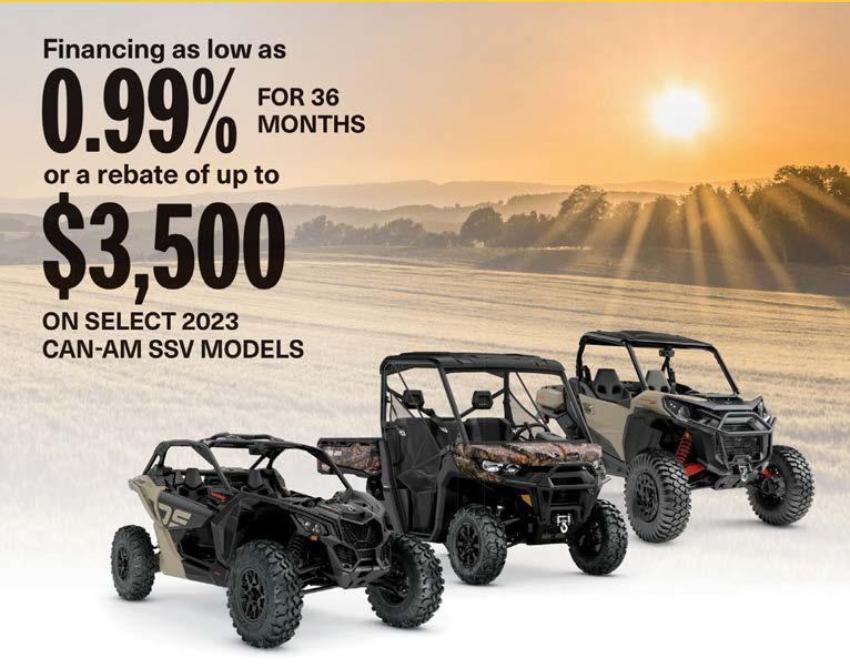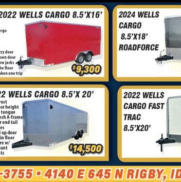 CAN-AM DEFENDER 700 - 900 - 1000 CAN-AM MAVERICK TRAIL 700 - 1000 CAN-AM MAVERICK X3 135 & 200 CAN-AM COMMANDER 700 - 1000 IN-STOCK FINANCING OPTIONS AVAILABLE BOTT YAMAHA 100 MAPLE, IDAHO FALLS (208) 522-1700 WWW.BOTTSALES.COM NON CURRENT YELLOW TAG CLEARANCE SPECIAL REBATES & FINANCING ON ALL 2022’S NEW 2022 CANAM DEFMAX HD10 BLUE...............................$17,999 NEW 2022 CANAM DEFMAX HD9 CAMO..............................$18,999 NEW 2022 CANAM DEFMAX HD10 TEXAS...........................$20,699 NEW 2022 CANAM MAV MAX DS RR......................................$18,999 *PRICES AFTER REBATES ©2024 Bombardier Recreational Products Inc. (BRP). All rights reserved. ®, TM and the BRP logo are trademarks of BRP or its affi liates. In the U.S.A., products are distributed by BRP US Inc. Off ers valid in the U.S.A. only between May 1, 2024, and June 30, 2024. The conditions may vary depending on your location and this off er is subject to termination or change at any time without notice. This off er is not refundable, exchangeable or transferable (including from one dealership to another), and cannot be redeemed for cash, credit or other products of equivalent value. Null where prohibited by law. While supplies last. Eligible units are all new and unused 2023 Can-Am SSVs. †Rates as low as 0.99% APR (Annual Percentage Rate) for 36 months. An example of monthly payments required over a 36-month term at a 0.99% APR: $28.20 per $1,000 fi nanced. An example of a monthly payment with $1,000 down, no rebate, an APR of 0.99% for 36 months at an MSRP of $10,000 is $253.83/mo. Total cost of borrowing is $138.02 with a total repayment obligation of $9,138.02. Down payment may be required. Other fi nancing off ers may be available. Minimum and maximum amounts fi nanced may vary. Not all buyers will qualify. Higher rates apply for buyers with lower credit ratings. Other qualifi cations and restrictions may apply, depending on the participating fi nancial institution(s). BRP is not responsible for any of the fi nancing terms and conditions. Off er subject to change without notice. Financing promotions void where prohibited. See your BRP dealer for details. ††Get a rebate of up to $3,500 on eligible 2023 Can-Am SSV models: Consumers who purchase an eligible model during the promotional period are eligible for a rebate of up to $3,500. BRP recommends that all ATV-SSV drivers take a training course. See your dealer or call the ATV Safety Institute at 1-800-887-2887 (USA) or the Canadian Safety Council at 1-613-739-1535 (Canada). ATVs and SSVs can be hazardous to operate. Never exceed the ATV-SSV’s passenger capacity. All adult-model ATVs are meant to be used by drivers of age 16 and older. Carefully read the vehicle’s operator’s guide. Follow all instructional and safety material and observe applicable laws and regulations. ATVs and SSVs are for off -road use only; never ride on paved surfaces or public roads. For your safety, the operator and passenger(s) must wear a helmet, eye protection and applicable protective clothing. Always remember that riding, alcohol and drugs don’t mix. Never engage in stunt driving. Avoid excessive speed and be particularly careful on diffi cult terrain. Always ride responsibly and safely. See your authorized BRP dealer for details and visit www.can-am.brp.com. HUGE REBATES ON NON CURRENT INVENTORY! ZERO DOWN FINANCING OAC WANTED MOTORSCOOTERS like Lambretta, Vespa, All State or Cushman in any condition and any year, parts, literature etc. Call/ text 801-201-5237. 1986 KIT Classic 5th wheel, attached awning, like new inside, $4800. 208-339-5757. IT! 2022 WELLS Cargo 7x14 cargo trailer, 7 interior height,