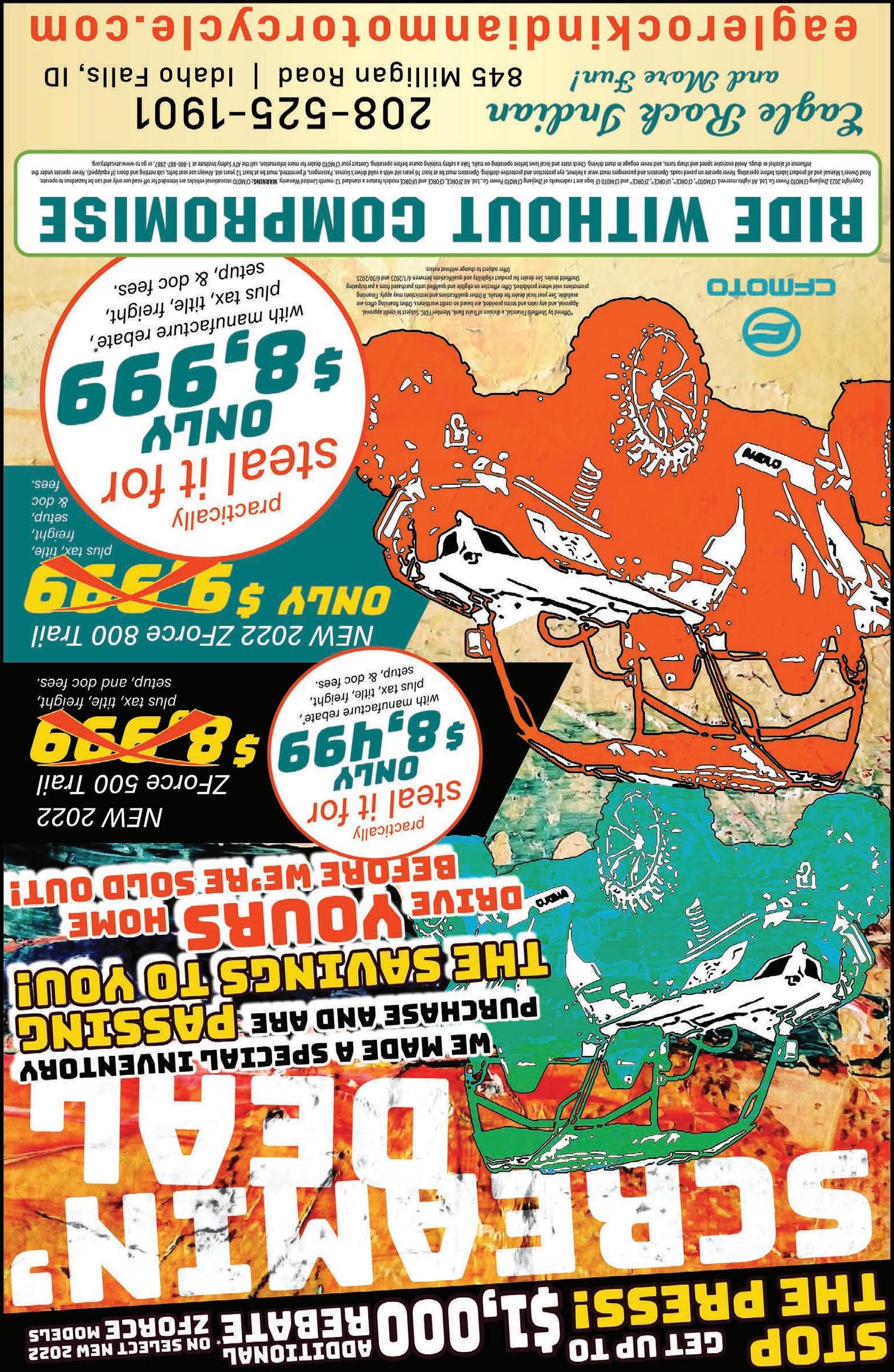 www.thriftynickelif.com BuyLocal! BRAUN U400 Wheelchair van lift. complete. $250. 208-290-6616. WANTED BLACK Leather Motorcycle jacket, XL. 208-840-9981. LITTLE GIANT Type 13' ladder $80. Swamp Cooler $100. Equalizer hitch $200. 208-251-4274. 2 CORD cottonwood. $175. Poplar area. 208-390-2009. eaglerockindianmotorcycle.com Subject to credit approval for financing offers. Not all buyers will qualify. Sales prices valid on in-stock items only and while supplies last. See dealer for details. Offers valid until June 30, 2023. 208-525-1901 845 Milligan Road | Idaho Falls, ID UP TO $1200 REBATES on Remaining 2022 CFMOTO Models PLUS 5.99% FINANCING THE FUEL, OXYGEN, AND SPORT TO GET YOU ROLLIN’. CFMOTO®reserves the right to vary specifications which are subject to change without notice. Images shown may include features that are not standard. Consult your dealer for details regarding the specifications of any featured product. Read the Owner’s Manual and review vehicle warning labels before operation. Get to know your machine and its capabilities. Brake in plenty of time. Always dress properly for your ride with a helmet, eye protection, and appropriate protective apparel such as a riding jacket or long-sleeve shirt, long pants, gloves and boots. Avoid excessive speeds and never engage in stunt riding. Observe good road manners and courteous behavior toward other motorists. Never ride under the in˜uence of alcohol or other drugs; it is illegal and deadly. Always inspect your CFMOTO vehicle before riding. For safety and training information, see your dealer or call CFMOTO at 763-398-2690. Copyright 2023, Zhejiang CFMOTO Power Co. Ltd. CFMOTO® is a registered trademark of Zhejiang CFMOTO Power Co., Ltd. All rights reserved. RIDE WITHOUT COMPROMISE youSavingswon’t want to miss! 2022 650 2022 2022 700 CL-X SPORT 2022 Installment Promo Name: 5.99% for 36 Months (Tier A) YM 2021 - 2023 [4.99% APR*] *Example: On a purchase where the Amount Financed is $7,500.00, your Down Payment is $0.00 with 36 monthly payments of $228.17 each. Interest rate is 5.99% [ANNUAL PERCENTAGE RATE is 5.99% (E)]. Note: The above financing programs are offered by Sheffield Financial, a division of Truist Bank, Member FDIC. Subject to credit approval. Approval, and any rates and terms provided, are based on credit worthiness. Other financing offers are available. See your local dealer for details. Rate advertised is based on minimum bureau risk score of 730. Minimum Amount Financed $1,500.00; Maximum Amount Financed $75,000.00. Other qualifications and restrictions may apply. An Origination Fee of $0.00 will be added to the amount financed in the above example. Financing promotions void where prohibited. Offer effective on eligible and qualified units purchased from a participating Sheffield dealer. See dealer for product eligibility and qualifications between 4/1/2023 and 6/30/2023. Offer subject to change without notice. [“E” means estimate] EXERCISE BIKE in good condition, $40 OBO. Pocatello 208-241-5352. NORDIC TRAC Treadmill. Programmable, like new. $75. 208-522-5673. Leave message. WANT TO buy steel work benches and or transmission bench. 208-497-8929. CONTINUOUS FENCING for sale. 4- bar 5-bar panels. Standard Duty and Heavy Duty. 20', 21', 24' length panels. Priced reduced for clearance. For price and Availability Call Russ Dial 208-317-6630. Isaiah 27:5