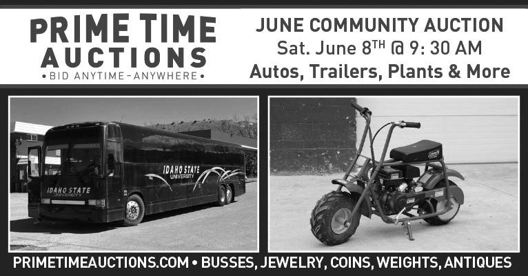 catello, Blackfoot and Idaho Falls. Jerry 208-530-0783. 208-971-2389 208-607-9097 Se habla espanol • Mowing Grass • Cutting Trees All Yard Work Services Offered! • Sprinkler Systems • Fencing and More! STEEL ROUND bar, 3.5"OD, 1045CR grade, 20'8"L, $390 each. 1"OD steel bar, 1045CR grade 20', $33 each. 25MM OD steel bar 4140CR grade, 24', $59 each. 208-681-0348. 9' RAILROAD TIES, #2 $25 per tie, #3 $21 per tie. SCREENED TOPSOIL, $20 per cu yd. Wolverine Rocks and Rubber, 208-521-6559, 6030 S Yellowstone Hwy, Idaho Falls, www. rocksandrubber.com SOFT CLOSE: Tues, June 4th @6pm (208)522-7984 For photos and details: www.bighornauctions.com ONLINE ESTATE AUCTION New Patio Furniture • Rubber Raft • Coolers • Tents • Peak & Mountain House Freeze Dried Meals • Camping • Fishing Items • Cannondale Trail 5 Mountain Bike • Univega DS700 Mountain Bike • Salsa Timberjack Mountain Bike • Univega DS700 Mountain Bike • Salsa Timberjack Mountain Bike • Archery Items • 1994 Chevy Suburban • 1968 Boston Whaler Boat w/ Motor • Antlers • Sofa • Recliners • Lift Chair • Freezer • Washer • Gas Dryer • Accent Chairs • Oak Bed • Console Table • Entry Table • Jewelry: Rings, Earrings, Necklaces, Brooch Pins, Watches • Coins: 1921 Peace Dollar, 1884-CC GSA Morgan Dollar • Graded Silver Dollars • Capped Bust Half Dollars • Liberty Seated Dimes & Half Dimes • Mint & Proof Coin Sets • Knife Collection • Miller Multimatic 215 Wire Feed Welder • Craftsman Drill Press • Grinders • Delta Scroll Saw • Ridgid Compound Miter Saw • Delta Bench Top 4” Belt 6” Disc Sander • Cement Mixer • Eletric Log Splitter • LC Smith SxS Shotguns • Heizer .410/45LC Pistol • Ruger Rifles • Mossberg Shotgun • Cimarron 45LC 7th Calvary Revolver • Springfield Saint Edge • AR15 Rifle • Ammo • Reloading Items • Hunting Gear • Stop Light • Walk/Don’t Walk Light • Milwaukee Packout • Antiques • Collectables and Much More! NEW ITEMS ADDED DAILY! 2895 North Holmes Idaho Falls, ID ALL THINGS Spring! We're open regular hours! 8am-5:30, Monday-Friday, 8am-Noon Saturday. Firth Mill & Elevator 101 East Center, Firth. 208-346-6122. CUTE SHEDS. Free Delivery. Low as $2565 or rent to own $119/ month. Howard Equipment & Supply. Shelley. 208-357-3200.