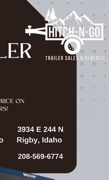 208-745-7077 OR 208-351-3755 G ROVERS A LL Air Lift 3rd Axle Allows 2023 SIDE DUMP $67,900 35’ Domex-100 Steel RideWell RideLight Air Suspension $ 24,500 High lift gate • Comes with pto, pump, tank, tower and controls 2022 LOEWEN 16’ DUMPBOX 2022 WELLS CARGO 8.5’ X 20’ $ 14,500 Silver Frost 7’ interior height 12” ext. tongue Armortech A-frame and rear end tail 3.5k axles rear roll up door D-rings in floor spare tire w/ wall mount LED lights 15,850 7’ Interior 2022 WELLS CARGO 8.5’ X 16’ ROADFORCE 13,900 UTV package • 7’ Int. height Rear ramp door • LED lights 3.5k axles w/ spring susp. 3/4” plexcore floor RT side entry dr Rear stabilizers Spare tire w/ wall mount 2022 WELLS CARGO 8.5’ X 16’ Gooseneck ball Receiver hitch $ 3,900 9’ FLATBED FOR HEAVY DUTY TRUCK Slide down rear load jacks Rear ramp door RV side entry door 12” extended tongue Road force pkg Spare tire w/ wall mount Bonded side panels $ 13,950 2022 WELLS CARGO 8.5’ X 16’ 9,800 USED 2022 WELLS CARGO 8.5’X16’ Stk # 22021 Enclosed Cargo Light Duty 7” Interior Spare Tire 32” side entry door Rear fold down door 12” fold donw jacks D-rings in the floor Like new, taken one trip 7’ interior height 12” fold down rear stabilizers 12” extended A-frame tongue Spare tire w/ wall mount RH RV entry door 2022 WELLS CARGO 7’ X 14’ CARGO TRAILER $11,000 14,200 • 12” EXT. tongue • 3.5k axles • Spring susp. • Rear ramp door 3/4” plexcore floor • Armortech coating, • UTV package • 7’ Int. height • 24” beavertail floor 2022 WELLS CARGO 8.5’ X 16’ 4140 E. 645 N. RIGBY, ID 9,800 7’ Interior height Rear ramp door Side RV entry door Interior dome light 4 D-rings in floor Spare tire w/ wall mount $ 9,300 7’ interior height Rear ramp door 12” fold down stabilizers Spare tire w/ mount D-rings in floor 2022 WELLS CARGO 7’ X 12’ 208-233-2011 208-529-9360 TARPS! RV Motorhome and boat, also great for carports, sheds and vehicle covers, durable material. 208-530-1616. If no answer leave message. NEW TRAILER parts store Now Open! Jacks, lights, axles, tires, rims, brakes, and much more. East Trailer Parts LLC. 340 East Anderson, Idaho Falls. 208-541-9106. FINANCING AS LOW AS 1.99% FOR 36 MONTHS † on select 2023 Can-Am SxS models ©2023 Bombardier Recreational Products Inc. (BRP). All rights reserved. ® TM and the BRP logo are trademarks of BRP or its affiliates. In the U.S.A., products are distributed by BRP US Inc. Offers valid in U.S.A. only between April 1, 2023 and July 31, 2023. The conditions may vary depending on your location and this offer is subject to termination or change at any time without notice. This offer is not refundable, exchangeable or transferable (including from dealership to another), cannot be redeemed for cash, credit or other products of equivalent value and cannot be combined with any other offer or rebate. Null where prohibited by law. Until supplies last. Eligible units are all new and unused 2023 Can-Am Maverick, Commanders, and Defenders models, excluding all CAB and Limited CAB models.† Rates as low as 1.99% APR (Annual Percentage Rate) for 36 months. Examples of monthly payments required over 36-month term at a 1.99% APR rate: $28.64 per $1,000 financed. An example of monthly payment with $2,074 down, no rebate, an APR of 1.99% APR for 36 months at an MSRP of $21,599 is $559.18/mo. Total cost of borrowing $604.82 with a total repayment obligation of $20,130.31. Down payment may be required. Other financing offers may be available. Minimum and Maximum Amount Financed may vary. Not all buyers will qualify. Higher rates apply for buyers with lower credit ratings. Other qualifications and restrictions may apply, depending on the participating financial institution(s). BRP is not responsible for any of the nancing terms and conditions. Offer subject to change without notice. Financing promotions void where prohibited. See your BRP dealer for details. BRP recommends that all SSV drivers take a training course. See your dealer. SSV can be hazardous to operate. Never exceed the SSV’s passenger capacity. All SSV models are meant to be used by drivers of age 16 and older. Carefully read the vehicle’s operator’s guide. Follow all instructional and safety material and observe applicable laws and regulations. SSV are for off-road use only; never ride on paved surfaces or public roads. For your safety, the operator and passenger(s) must wear a helmet, eye protection and applicable protective clothing. Always remember that riding and alcohol/drugs don’t mix. Neve engage in stunt driving. Avoid excessive speed and be particularly careful on difficult terrain. Always ride responsibly and safely. See your authorized BRP dealer for details and visit www.can-am.brp.com. BOTT YAMAHA 100 MAPLE, IDAHO FALLS (208) 522-1700 WWW.BOTTSALES.COM CAN-AM DEFENDER 700 - 900 - 1000 CAN-AM MAVERICK TRAIL 700 - 1000 CAN-AM MAVERICK X3 135 & 200 CAN-AM COMMANDER 700 - 1000 IN-STOCK FINANCING OPTIONS AVAILABLE SEE BOTT YAMAHA TODAY FOR YOUR NEXT CAN-AM