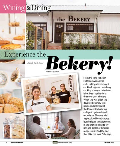From the time Rebekah Hoffpauir was a small child baking store-bought cookie dough and watching cooking shows on television, it has been her life-long dream to own a bakery. When she was older, she devoured culinary text books and interned at the Pioneer Club during college to gain real-world experience. She attended a specialized bread course, but she loves to experiment in the kitchen. “I like to try bits and pieces of different recipes until I find the one that I like the most,� she says. 6 www.thriveswla.com