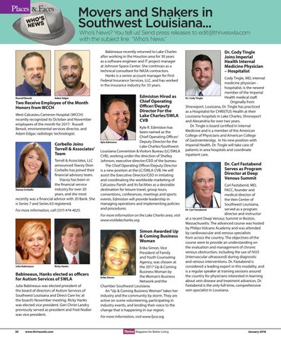 Who’s News? You tell us! Send press releases to edit@thriveswla.com with the subject line “Who’s News.” Babineaux recently returned to Lake Charles after working in the Houston area for 30 years as a software engineer and IT project manager at Johnson Space Center. She continues as a technical consultant for NASA contractors. Hanks is a senior account manager for First Federal Insurance Services, LLC, and has worked in the insurance industry for 35 years.