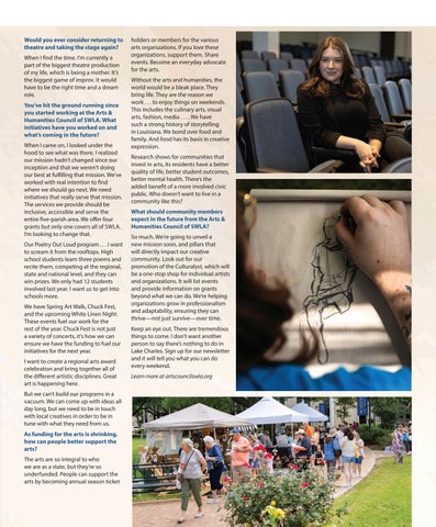 holders or members for the various arts organizations. If you love these organizations, support them. Share events. Become an everyday advocate for the arts. Without the arts and humanities, the world would be a bleak place. They bring life. They are the reason we work . . . to enjoy things on weekends. This includes the culinary arts, visual arts, fashion, media . . . . We have such a strong history of storytelling in Louisiana. We bond over food and family. And food has its basis in creative expression. Research shows for communities that invest in arts, its residents have a better quality of life, better student outcomes, better mental health. There’s the added benefit of a more involved civic public. Who doesn’t want to live in a community like this? What should community members expect in the future from the Arts & Humanities Council of SWLA? So much. We’re going to unveil a new mission soon, and pillars that will directly impact our creative community. Look out for our promotion of the Culturalyst, which will be a one-stop shop for individual artists and organizations. It will list events and provide information on grants beyond what we can do. We’re helping organizations grow in professionalism and adaptability, ensuring they can thrive—not just survive—over time. Keep an eye out. There are tremendous things to come. I don’t want another person to say there’s nothing to do in Lake Charles. Sign up for our newsletter and it will tell you what you can do every weekend. Learn more at artscouncilswla.org