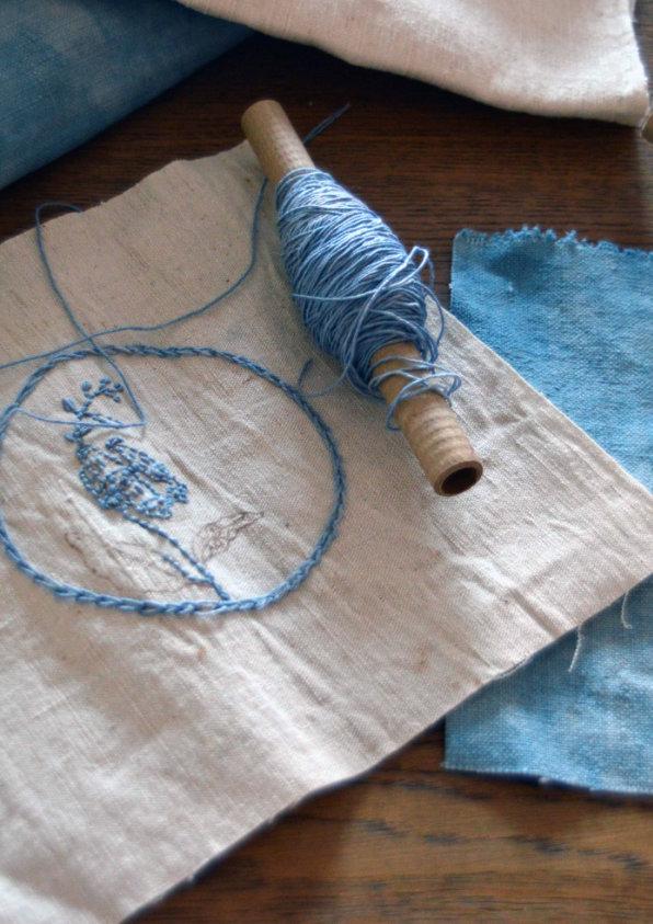 ForTrace,Emiwillhostaworkshopteaching howtostitchabotanicallyinspiredmotifona teatowelofvintagecloth,withyarnhanddyed withindigobyEmi.