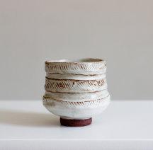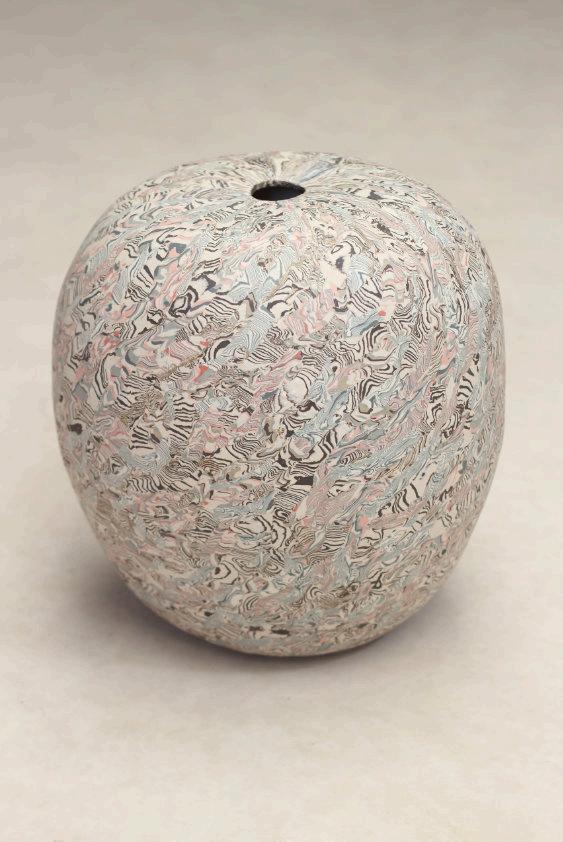 Eachstriationoriginatesfromhundredsofslabs meticulouslylayered.Withthousandsoflifts, patsandslapsthelayerscompress.Asliceis takenfromtheselayeredloaves,whicharethen pressedintolinedtableware.Atechnique knownasNerikomi.Thewasteoftheprocess hasbeencollectedoveryearsofproductionand nowformsintoSam'smostprominentpieces. Thetanandbrownclaysarethehomogenous blendofblackandwhitewaste.Off-cutsfrom variousbatcheshavebeeninlaidandintricately joinedtogethertocreatebelliedformsfrom waste.