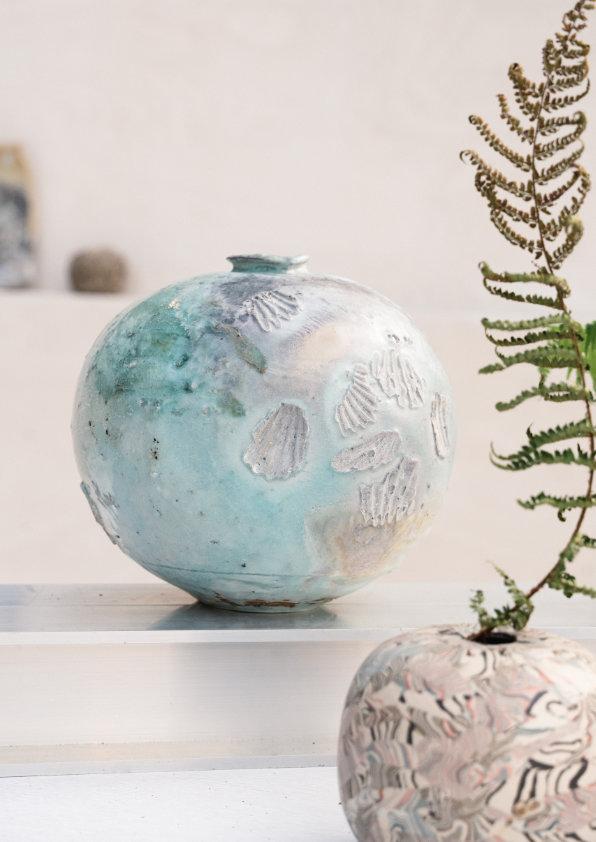 Theyareconsideredalongtheway-Irarelywork outtheglazetypeorcolourbeforehand,some claysdon’twanttobeglazedinanycase.Ilove placingworkonplinthsandblocksbecause suddenlytheybecomepartoftheworkitself.I havemanylyingaroundtotryout,andthe pairingbecomesobviousafterswappingafew around.Thentheworkfeelsfinished.