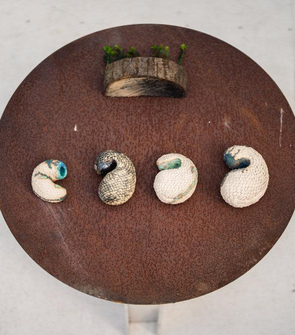 Ican'trememberIwassoyoung,mymum taughtme.Shestudiedceramicsfor5yearsin London,withnotabletutorsEmmanuelCooper andMoJupp.Iremembermakingamudhut withastrawroofandaworkingocarinafor differentschoolprojects,aswellasmakinga monster,afantasyhouseandabeetleinclasses withmymumandmyschoolmates.Ithrewaset ofplatesformyselftotaketoUniversity.