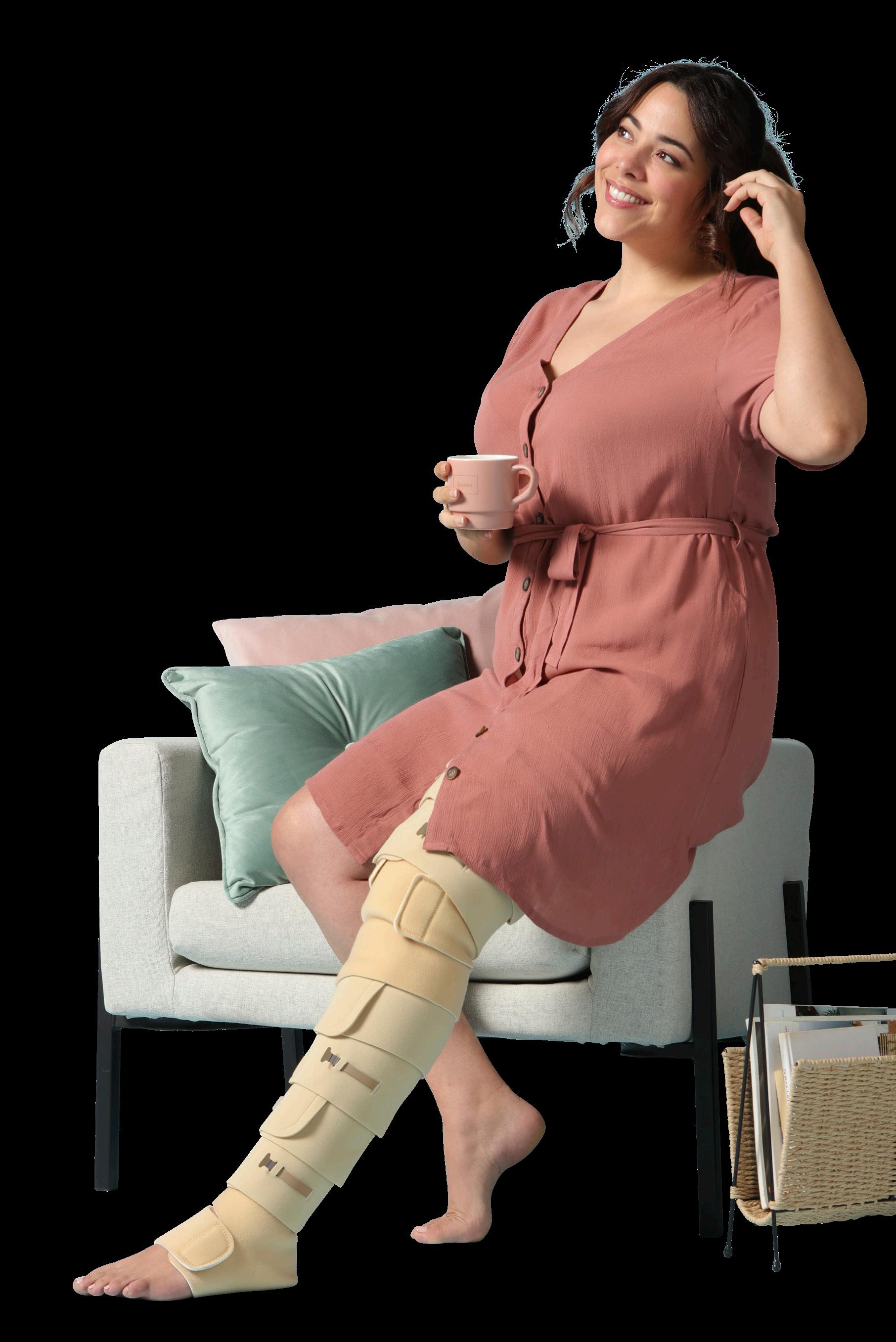 Justerbar fotdel med lättare kompression för att motverka ödemansamling i foten. Fotdelen kan vid behov kombineras med vaddelen.